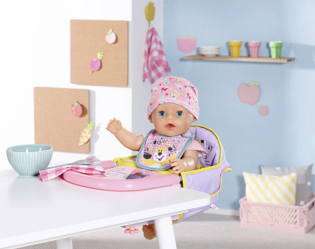 Materialul textil moale ajută la menținerea curată a hăinuțelor păpușii, fie că „servești” piure sau supă în timpul jocului.