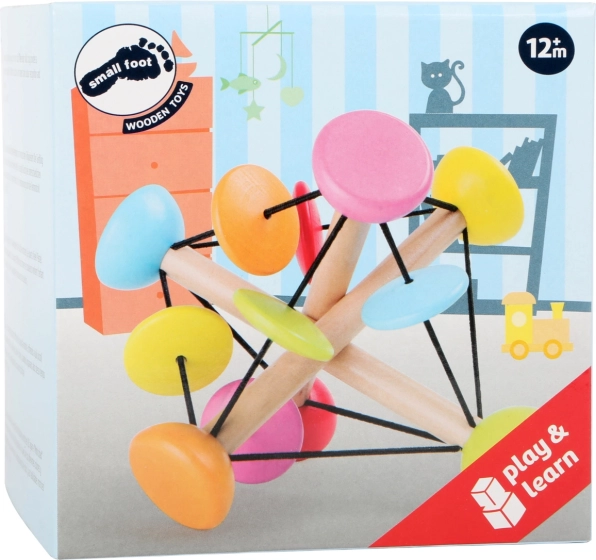 Această jucărie motrică ingenioasă de la small foot este concepută pentru mânuțele copiilor mici. Trei bețe din lemn conectate prin elastice flexibile formează o structură stabilă, dar suplă, pe care copiii o pot modela liber. Mărgelele colorate, atunci când sunt deplasate și rotite, produc un sunet plăcut, susținând dezvoltarea senzorială și concentrarea.