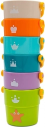 Paharele pot fi aranjate în piramidă sau introduse unul în altul. Culorile vii cu grafică simplă facilitează sortarea și învățarea culorilor.