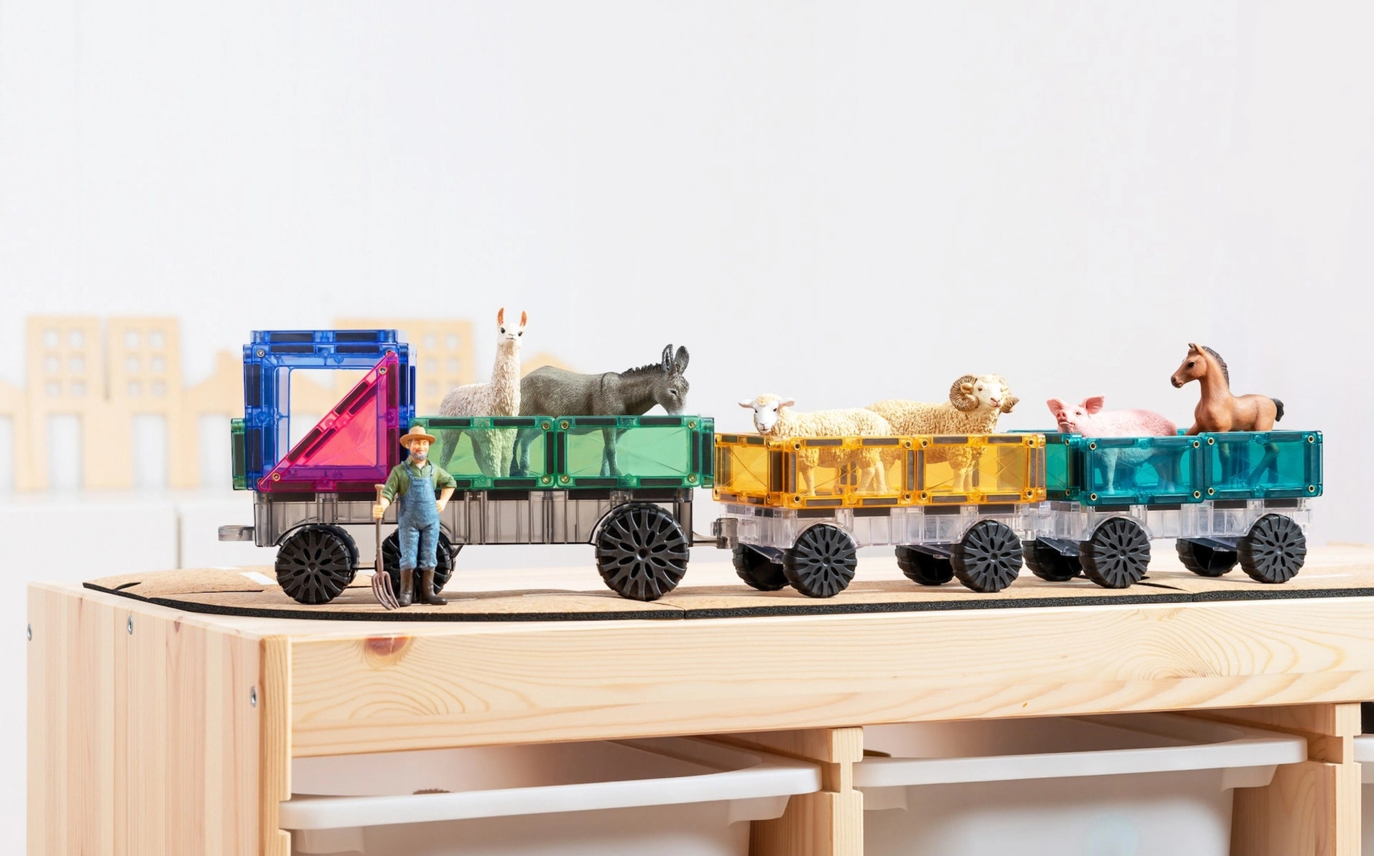 Trei șasiuri cu roți transformă setul în mașini, trenuri sau rachete. Copiii construiesc, reconstruiesc și explorează mișcarea și stabilitatea structurilor în practică.