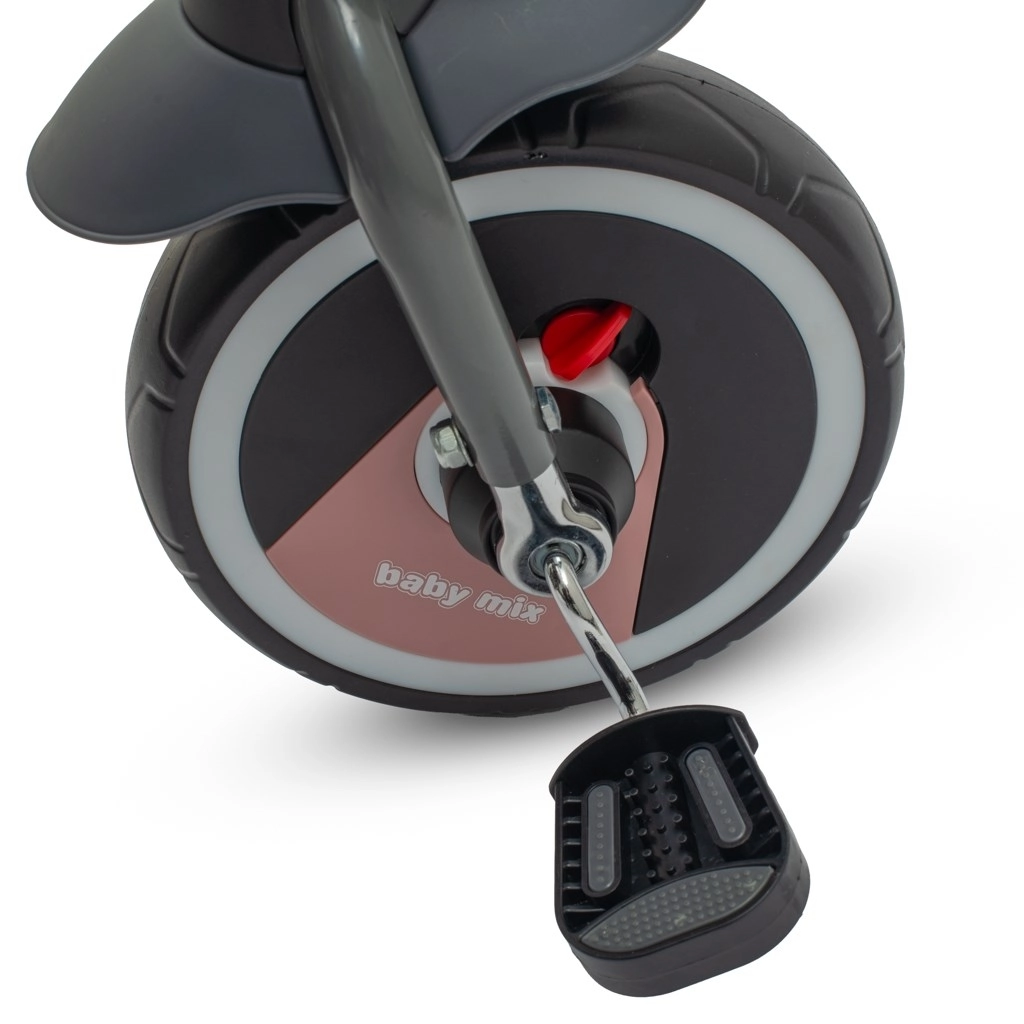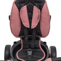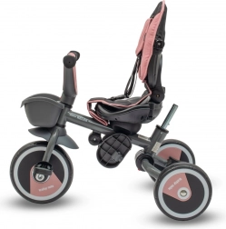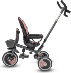 Această tricicletă combină confortul, siguranța și versatilitatea. Scaunul rotativ și glisant, cu înclinare reglabilă a spătarului, permite mersul atât cu fața, cât și cu spatele la direcția de deplasare, în timp ce centurile în 5 puncte și bara detașabilă oferă siguranță maximă. Capotina mare, pliabilă cu fereastră protejează de soare și permite supravegherea continuă a copilului.