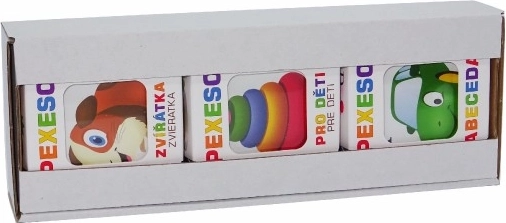 Pexeso este unul dintre cele mai populare jocuri pentru copii, care de asemenea ajută la dezvoltarea lor. Acest set conține trei tipuri diferite de pexeso în cutii metalice, axate pe abecedar, animăluțe cu engleză și jocuri pentru copii.
