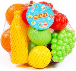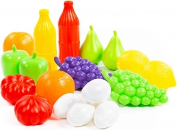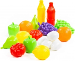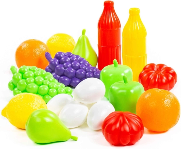 Setul include struguri, mere, citrice, roșii și alte piese care stimulează imaginația și îi învață pe copii să distingă tipurile de alimente și culorile.