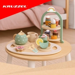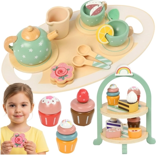 Transformați fiecare după-amiază într-o petrecere de ceai fermecată! Acest set din lemn Kruzzel, cu o etajeră stilată, aduce copiilor lumea fanteziei cofetăriei. Conține ceainic, cești, tacâmuri și deserturi dulci – toate din lemn neted, sigur, în culori pastelate delicate. Susține creativitatea, motricitatea fină și abilitățile sociale, este ideal de la 3 ani și se remarcă prin execuție durabilă și certificare CE/EN71.