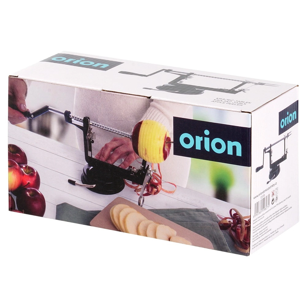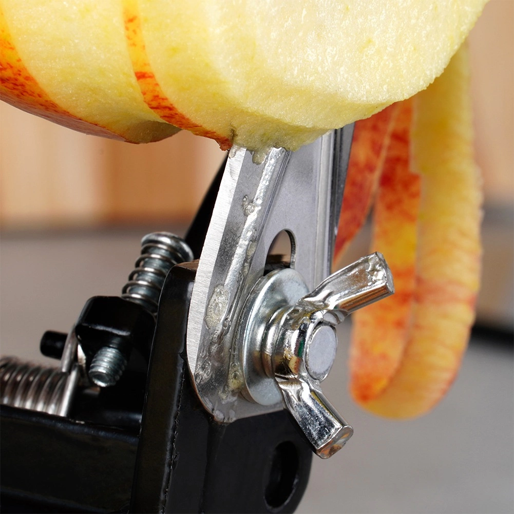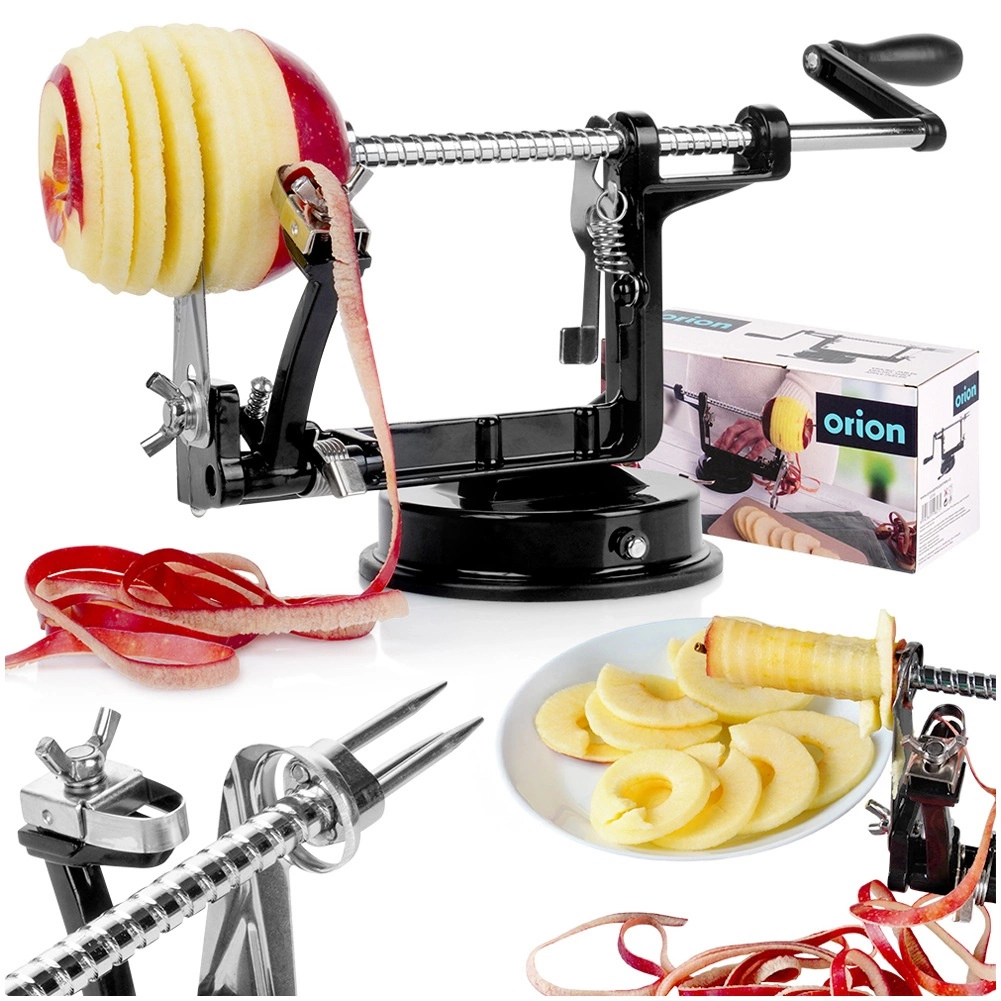Prin rotirea lină a manivelei veți curăța coaja, veți scoate cotorul și veți tăia inele regulate cu grosimea de circa 3 mm. Ideal pentru deserturi, chipsuri și deshidratare.