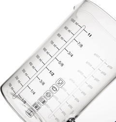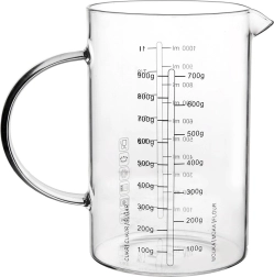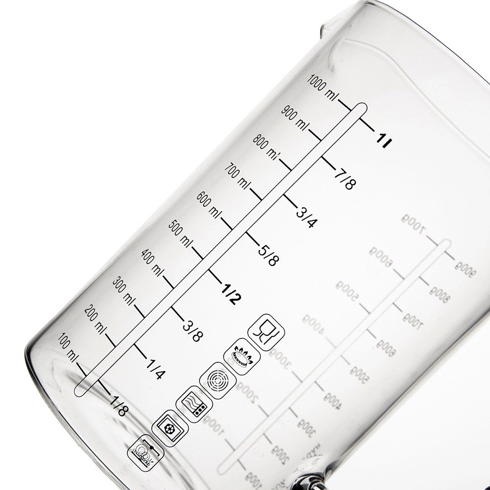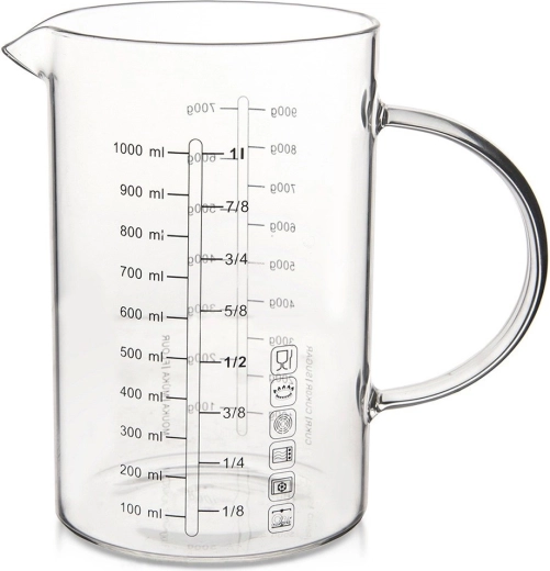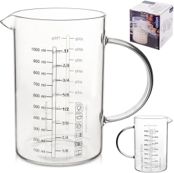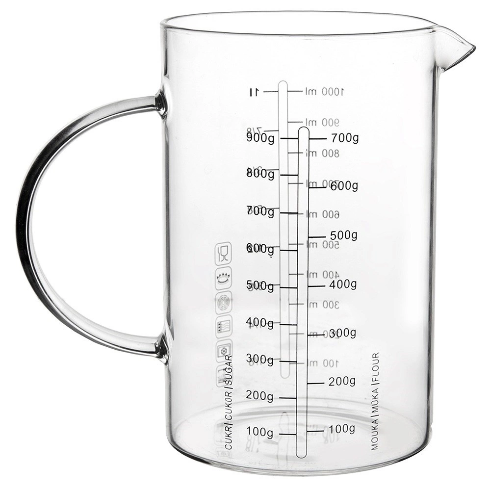 Cană gradată practică din sticlă, sub forma unui ulcior cu mâner și cioc pentru măsurarea precisă a lichidelor și a ingredientelor solide. Are scale lizibile în ml/l și în grame pentru făină și zahăr, este fabricată din sticlă borosilicată rezistentă la temperaturi de la -40 °C la +300 °C și poate fi spălată în mașina de spălat vase și folosită în cuptorul cu microunde.
