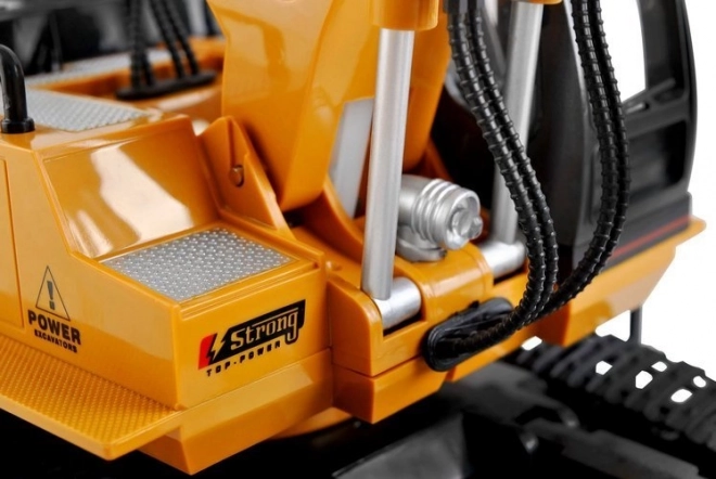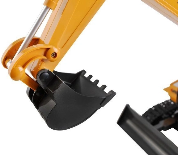 Excavatorul controlat de la distanță are o construcție caracteristică vehiculelor masive de construcție și o schemă clasică de vopsea - caroseria galbenă este combinată cu multe detalii contrastante în negru.