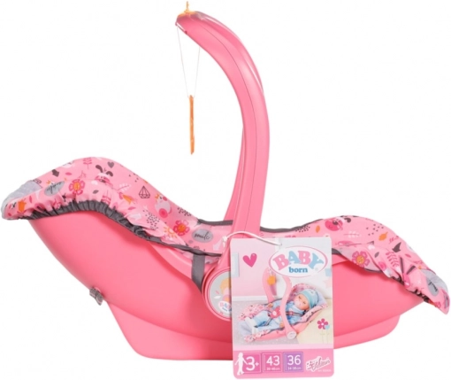 Acest scaun auto și port-bebe roz, elegant, pentru păpuși BABY born este conceput pentru copii de la 3 ani. Datorită carcasei din plastic robust, husei moi și centurii de siguranță, oferă păpușii confort și sprijin atât la transport, cât și la odihnă. Mânerul rotativ permite trecerea rapidă din modul transport în modul ședere sau legănare.