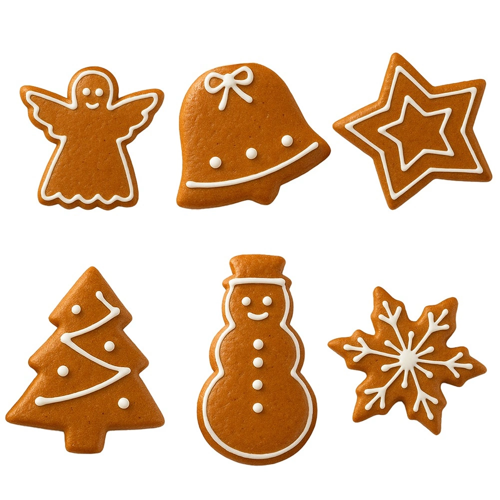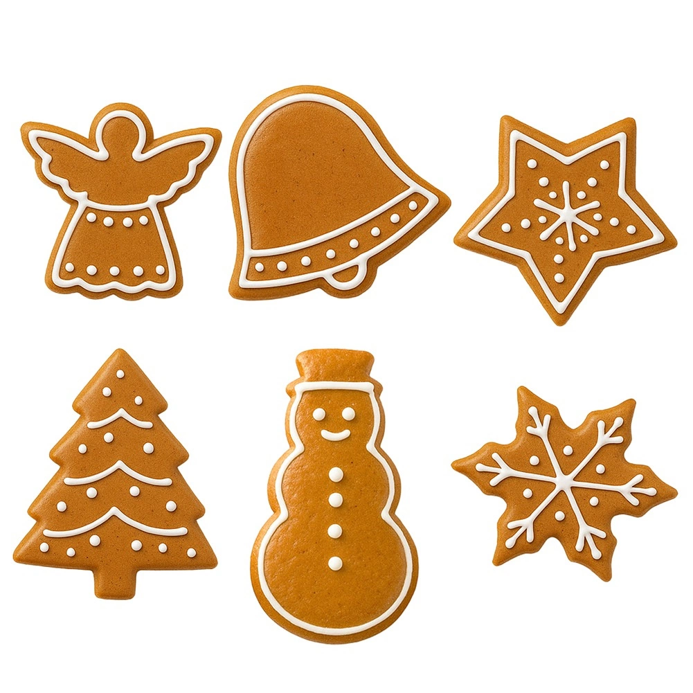Înger, clopoțel, stea, brăduț, om de zăpadă și fulg de zăpadă – tot ce ai nevoie pentru coacere creativă și decorare festivă.