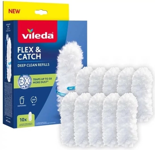 Capetele de rezervă practice pentru pămătuful VILEDA Flex & Catch asigură îndepărtarea rapidă și temeinică a prafului chiar și din locurile greu accesibile. Datorită fibrelor 360°, captează de până la 3× mai mult praf decât pămătufurile obișnuite, au o suprafață de curățare cu 20% mai mare și sunt fabricate din fibere 100% reciclate pentru o curățenie mai sustenabilă.