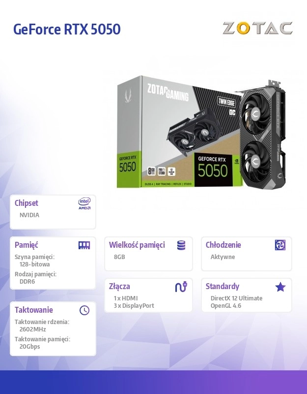 ZOTAC GAMING GeForce RTX 5050 Twin Edge OC este concepută pentru jucătorii care caută o placă video compactă, dar performantă. Arhitectura modernă NVIDIA Blackwell și tehnologia DLSS 4 permit rate de cadre mai ridicate, imagine mai clară și o experiență de joc mai fluidă în Full HD și QHD.
