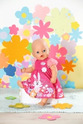 Oferă-i păpușii tale BABY BORN o ținută stilată pentru fiecare zi. Această rochiță roz, cu imprimeu vesel de flori și iepurași jucăuși, încântă prin finisajele detaliate, aplicațiile 3D și mânecuțele din tulle care amintesc de petalele florilor. Datorită cusăturilor de calitate și îmbrăcării ușoare, este ideală pentru mânuțele mici.