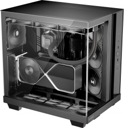 Suport pentru radiatoare până la 360 mm, plăci grafice până la 400 mm și plăci ATX. Două poziții pentru sursă pentru plăci cu conectori posteriori și în același timp suport pentru 2× HDD și 2× SSD.