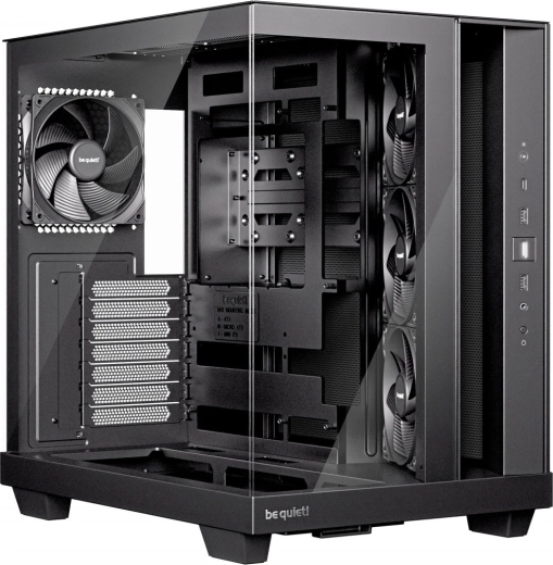 Din fabrică sunt montate 4 ventilatoare Pure Wings 3 120 mm PWM – cele laterale cu pale inversate pentru un aspect curat, pale optimizate pentru debit ridicat și turbulențe scăzute.