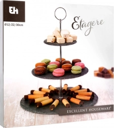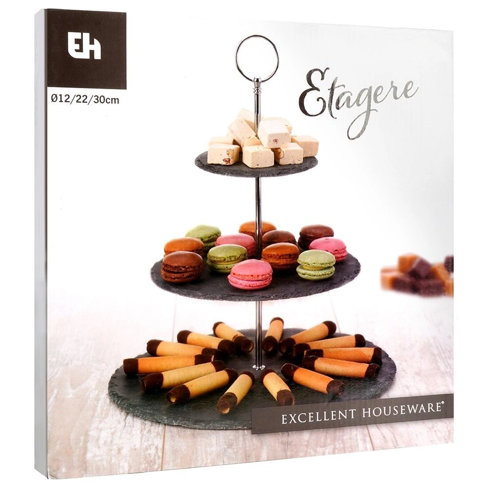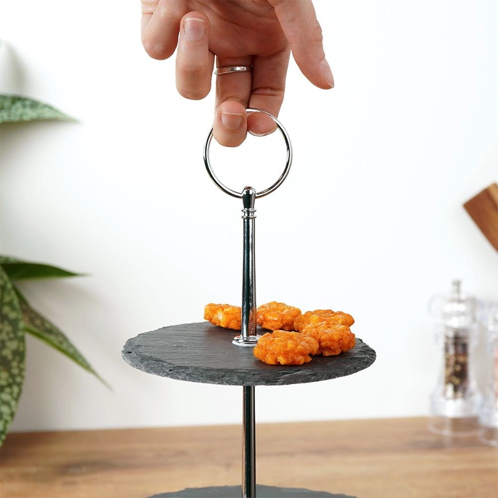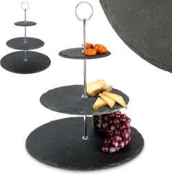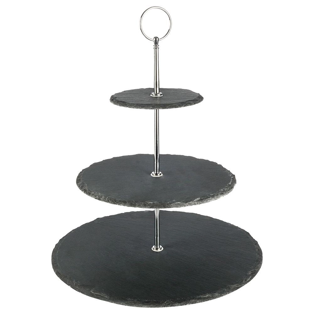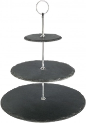 Platoul pe trei niveluri din ardezie neagră adaugă mesei tale un aspect modern și natural. Ideal pentru servirea brioșelor, biscuiților, macarons, brânzeturilor, fructelor și gustărilor sărate. Datorită ochiului superior practic, îl poți muta ușor din bucătărie pe masă.