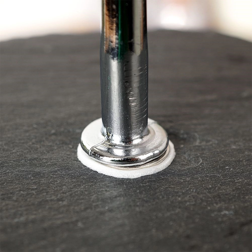 Platourile robuste din piatră și tija metalică solidă cu aspect cromat oferă stabilitate, în timp ce cele patru piciorușe de protecție protejează blatul mesei de zgârieturi. Construcția pliabilă permite montarea rapidă și depozitarea compactă atunci când nu servești.