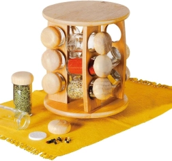 Acest set elegant din 13 piese este o soluție excelentă pentru depozitarea condimentelor într-un mod ordonat și stilat. Suportul rotativ din lemn tare este robust și susține în siguranță 12 borcănașe transparente de 80 ml, astfel încât vedeți mereu conținutul fără a le deschide. Datorită capacelor din lemn și sitelor în variantă albă, dozați cu ușurință și protejați totodată aroma și prospețimea amestecurilor preferate.