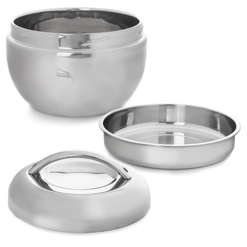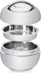 - Trei piese: bol, caserolă/farfurie din inox, capac cu mâner