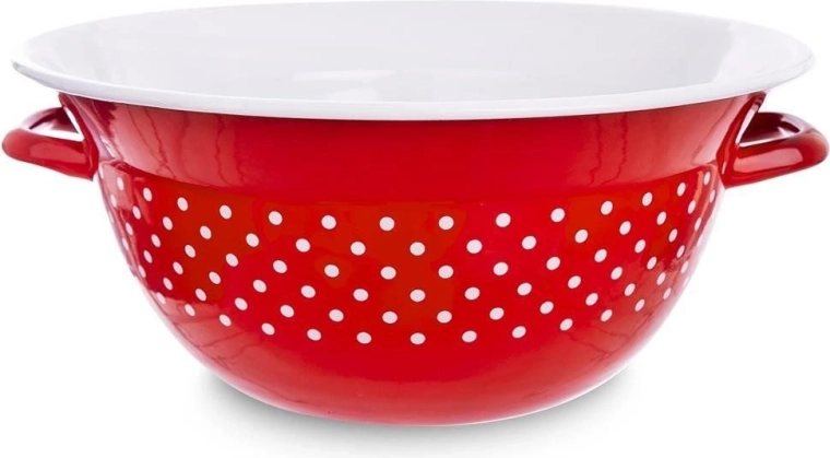 Bolul emailat cu mânere, în stil retro îndrăgit, este ideal pentru frământarea aluatului, amestecarea ingredientelor și pregătirea salatelor. Oțelul rezistent cu strat email de calitate este igienic, neutru la gust și sigur pentru contactul zilnic cu alimentele. Execuția elegantă în roșu cu buline albe va înfrumuseța orice bucătărie și masă.