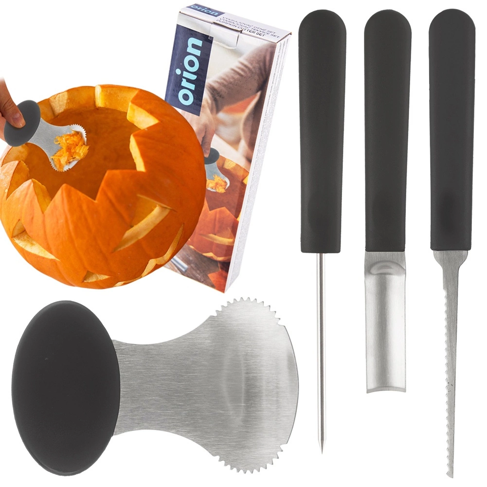 Acest set din 4 piese pentru gravat și scobit dovleci, fructe și legume transformă ideile tale în decorațiuni spectaculoase. Uneltele special profilate permit tăiere precisă, curățarea ușoară a interiorului și lucru mai sigur decât cu cuțitele de bucătărie obișnuite.
