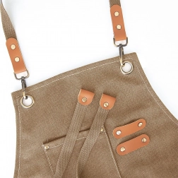Construcția bine gândită, cu bretele încrucișate la spate, distribuie uniform greutatea și menține șorțul sigur pe poziție. Buzunarul frontal dublu și compartimentul mai mic găzduiesc accesorii de bucătărie sau de lucru, în timp ce două bride sunt ideale pentru creion sau unealtă.