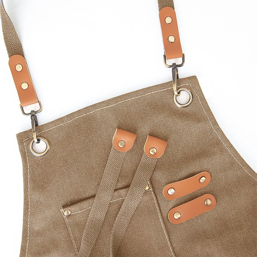 Pânză rezistentă cu cusături ranforsate, inele metalice și elemente din piele ecologică pentru o durată lungă de viață în bucătărie și atelier.