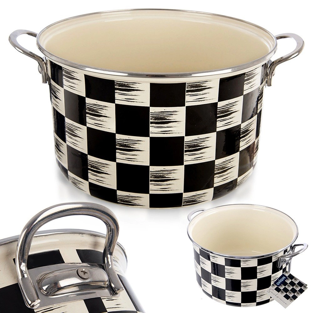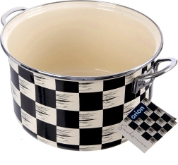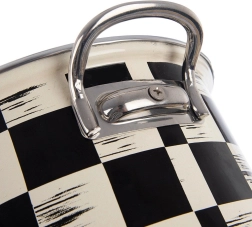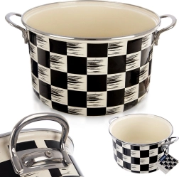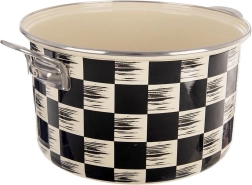 Oală emailată stilată cu volum de 6,5 l și diametru de 26 cm, în design șah negru-bej. Fabricată din oțel emailat de calitate cu margine din inox și mânere metalice pentru prindere sigură. Potrivită pentru toate tipurile de aragazuri, inclusiv inducție, pentru cuptor și mașină de spălat vase – ideală pentru supe, sosuri și preparate înăbușite.
