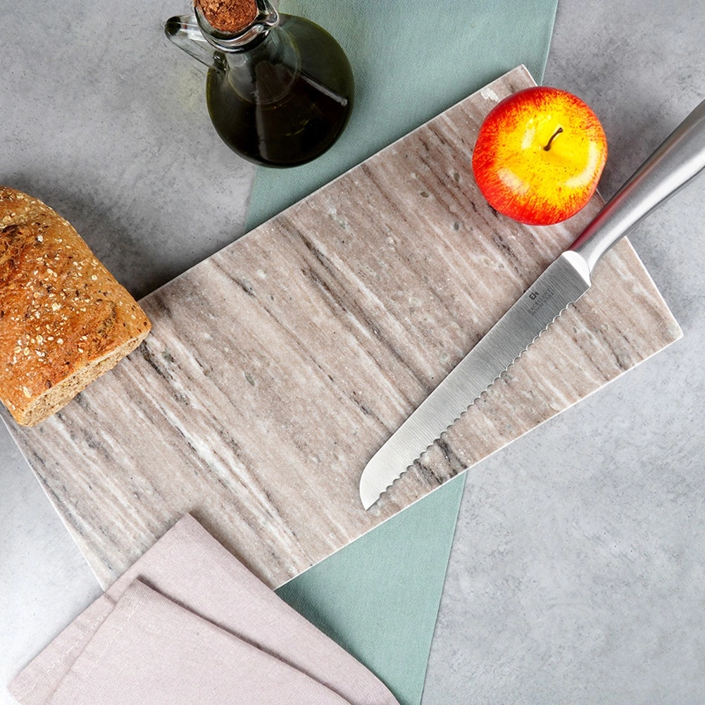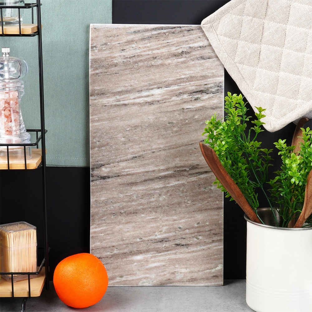 Placă versatilă din marmură naturală, în nuanțe de bej și gri, care aduce în bucătărie o combinație de funcționalitate și design. Poate fi folosită ca suprafață robustă de tăiere și ca platou de servire stilat pentru brânzeturi, mezeluri, fructe sau deserturi. Marmura este în mod natural rezistentă la căldură și, datorită suprafeței sale reci, ajută la menținerea alimentelor proaspete mai mult timp.