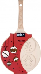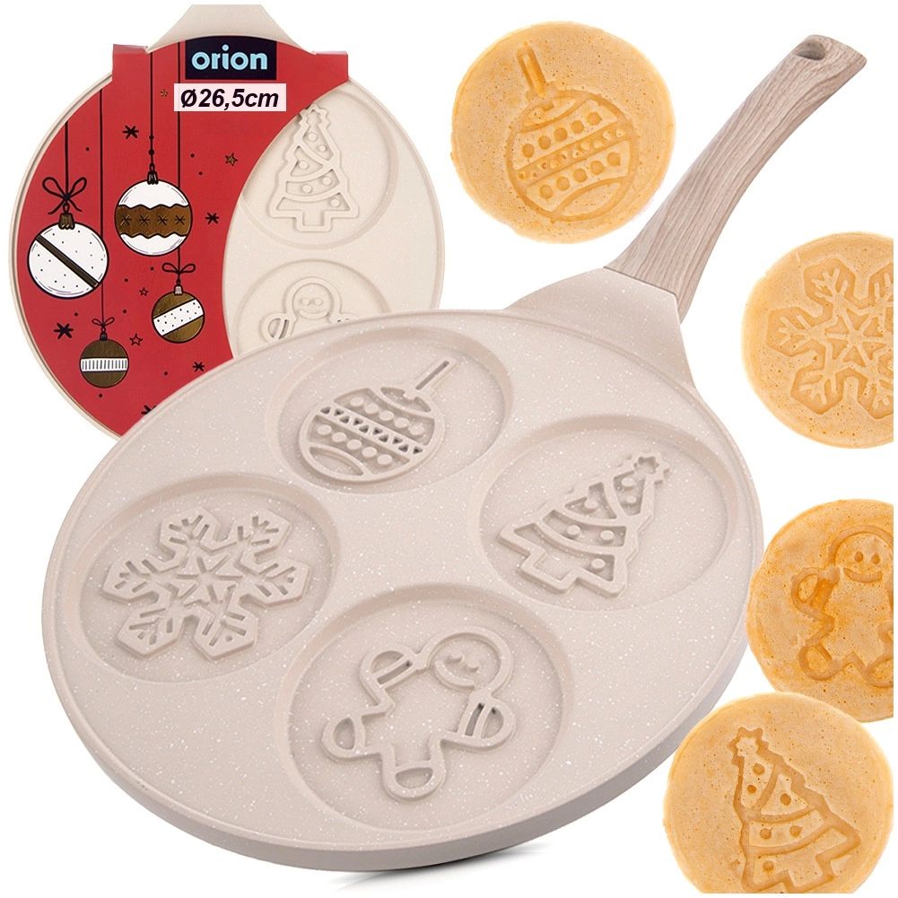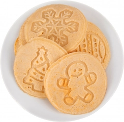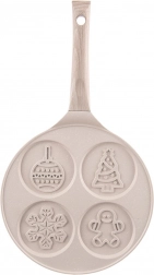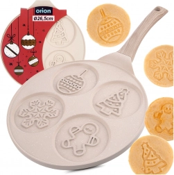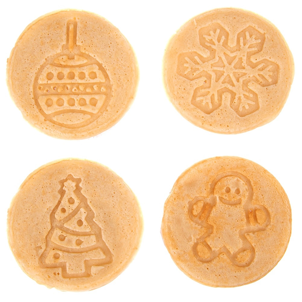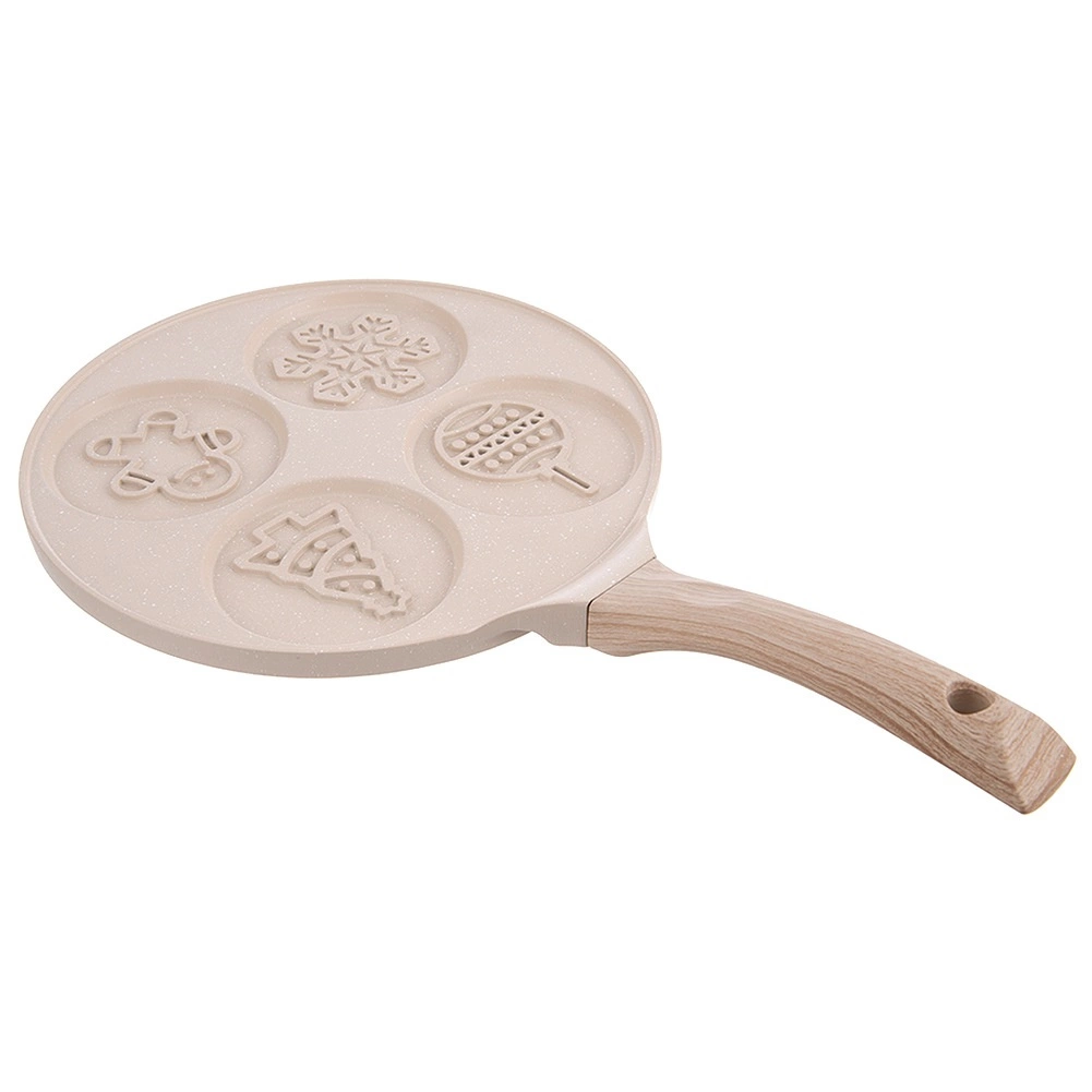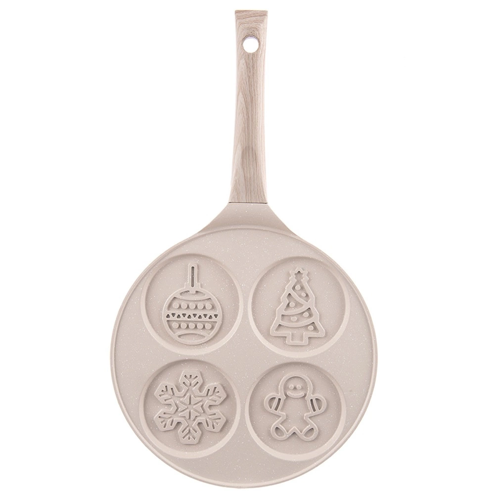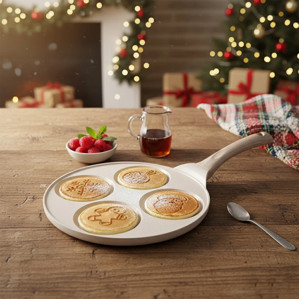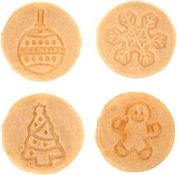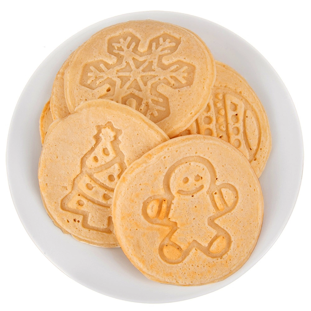 Patru forme circulare cu relief de glob, brăduț, om de turtă dulce și fulg creează porții jucăușe de clătite și ouă – ideale pentru copii și pentru mesele festive.