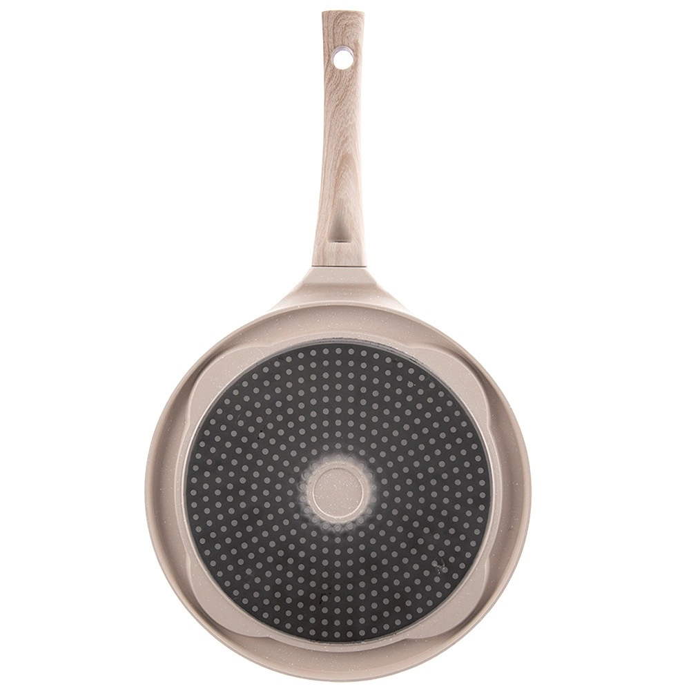 Corpul masiv din aluminiu conduce excelent căldura pentru prăjire rapidă și economică, iar căldura se distribuie uniform pe toată suprafața. Mânerul ergonomic este confortabil, antiderapant și are un orificiu pentru agățare practică. Tigaia este compatibilă cu toate tipurile de aragaz, inclusiv inducție, și se curăță ușor – este potrivită pentru mașina de spălat vase.