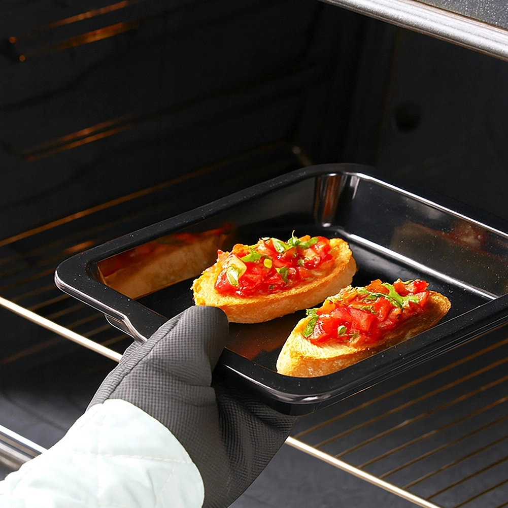 Marginile mai înalte de 5 cm împiedică scurgerea sucurilor și sosurilor, ceea ce ușurează manipularea și mutarea sigură a tăvii. Dimensiunea universală încape în majoritatea cuptoarelor de acasă și oferă performanță fiabilă în utilizarea de zi cu zi.