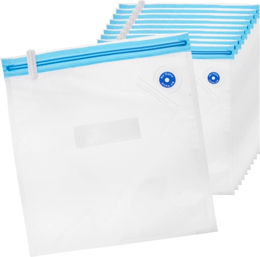 Păstrați alimentele proaspete mai mult timp și perfect organizate. Pungile vid 26 × 28 cm reutilizabile, cu fermoar dublu și valvă pentru evacuare, protejează împotriva aerului, umidității și mirosurilor. Sunt potrivite pentru frigider și congelator, iar datorită foliei de nailon durabile, fără BPA, rezistă la temperaturi de la −20 °C la +110 °C.