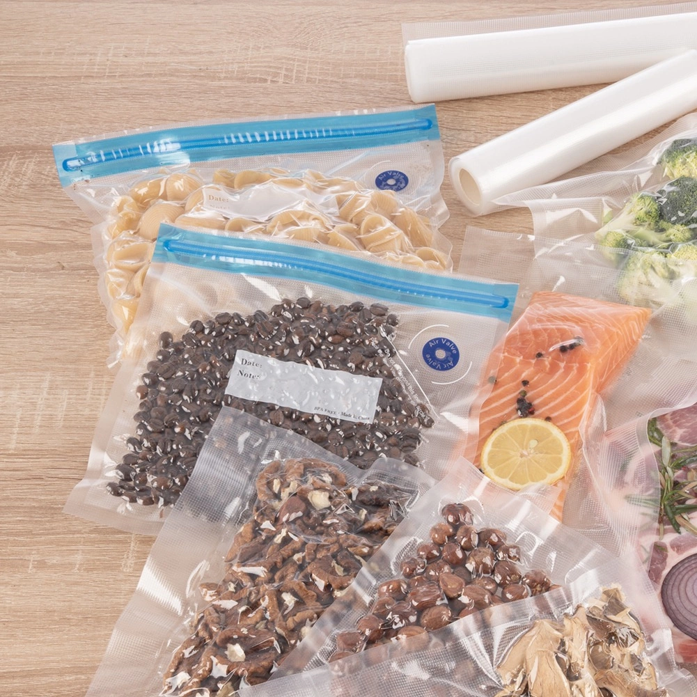 Etanșare ermetică fiabilă datorită fermoarului dublu și valvei pentru evacuarea rapidă a aerului. Alimentele rămân proaspete mai mult timp și protejate.