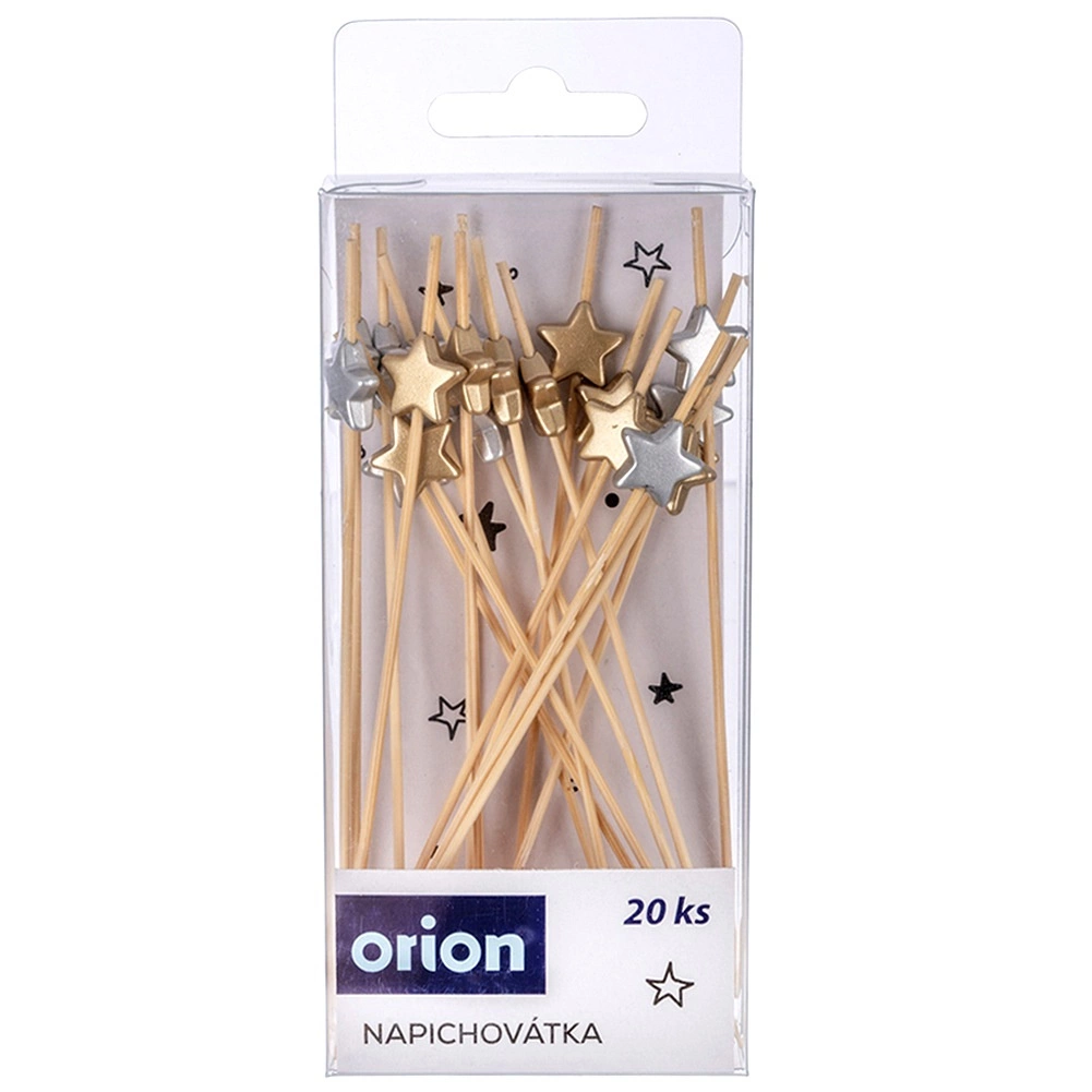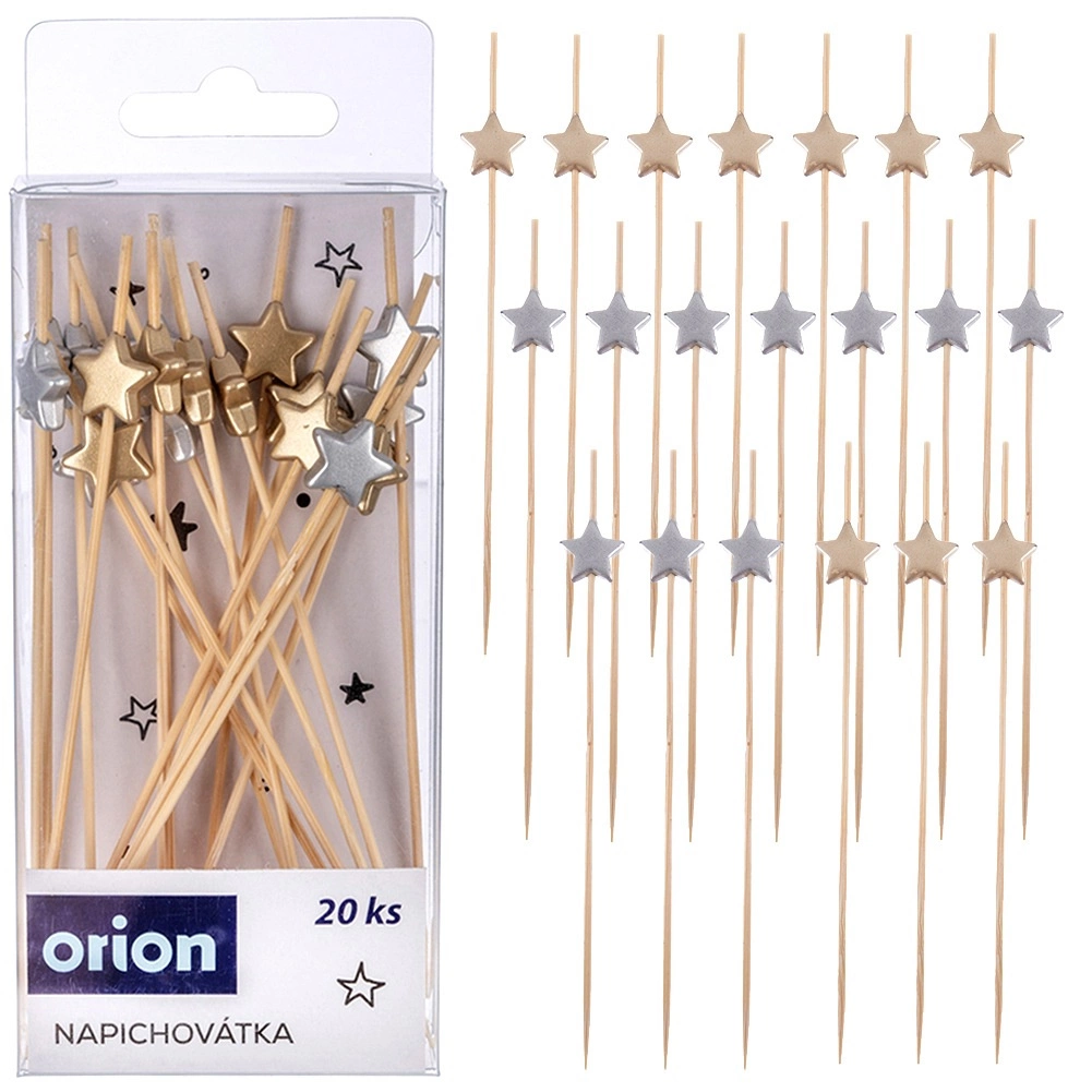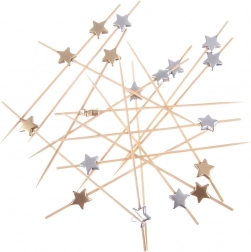Înviorați prezentarea gustărilor cu ajutorul bețelor decorative cu steluțe. Bambusul natural combinat cu decorațiunea din lemn în finisaj auriu și argintiu asigură o prezentare atrăgătoare și o înțepare comodă. Fiecare pachet conține 20 de bucăți cu lungimea universală de 12 cm.