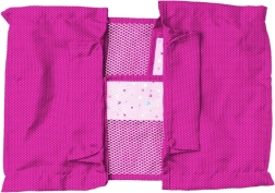 Pătuțul roz cu cadru metalic este ideal pentru joaca acasă sau în aer liber. Este portabil și ușor.