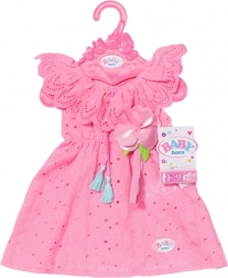 Hăinuța este concepută pentru păpușile BABY born de 43 cm și este o bază excelentă pentru jocuri de rol, dezvoltarea motricității fine și a imaginației. În pachet este inclus și un umerar roz pentru depozitare comodă în dulapul păpușii.
