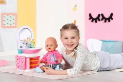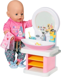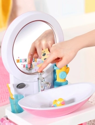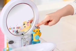 Învățați copiii obiceiuri corecte de igienă prin joc. Chiuveta alb-roz pentru păpușa BABY born oferă efecte luminoase și sonore, jet real de apă la apăsarea robinetului și accesorii drăguțe pentru îngrijire completă. După aprinderea oglinzii se aude o melodie care servește drept cronometru jucăuș pentru spălatul pe mâini.