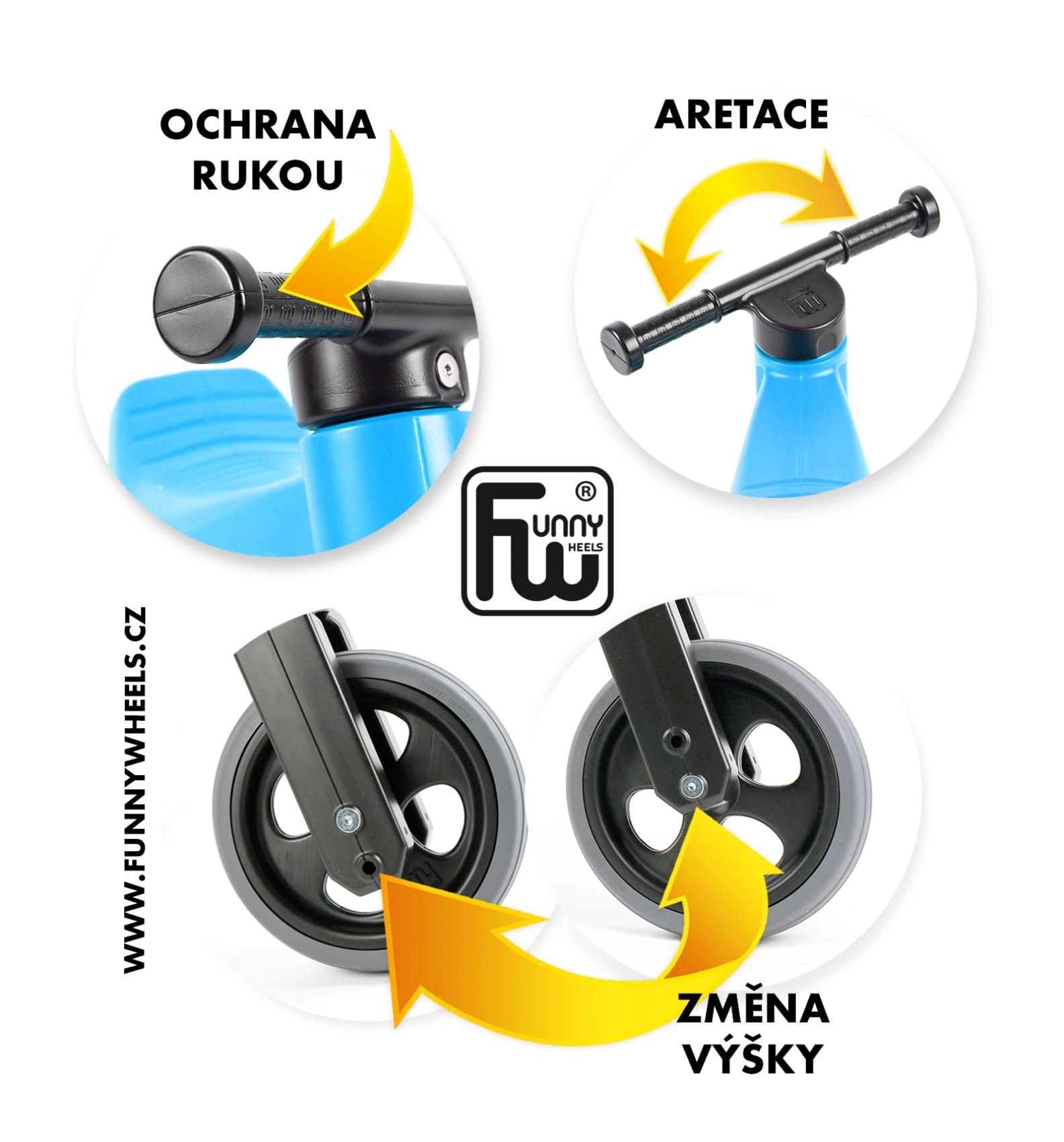 Rotirea limitată a furcii previne răsucirea ghidonului, capetele lărgite protejează mâinile, iar plasticul rezistent și sigur are îmbinări netede.