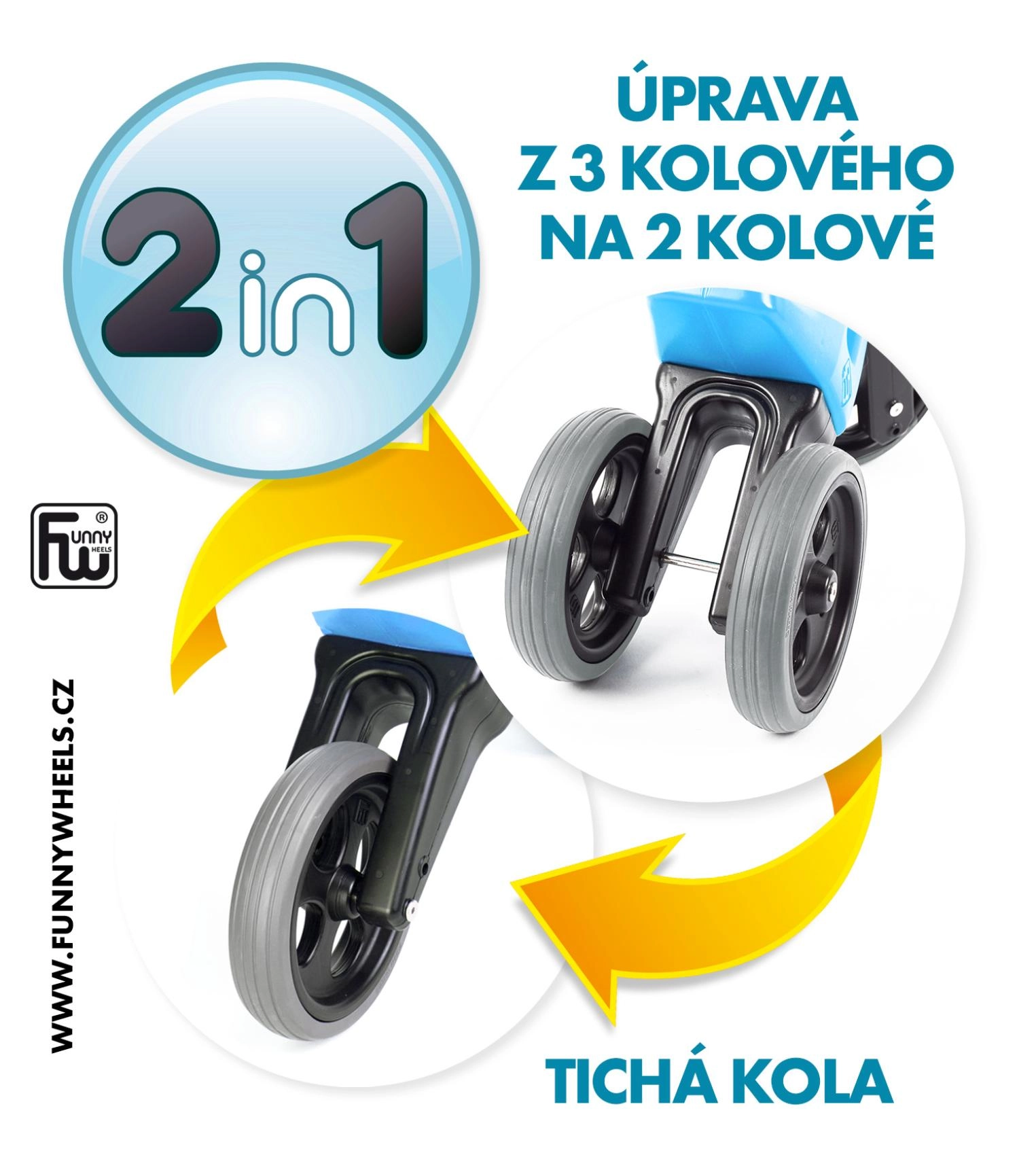 FUNNY WHEELS Rider Sport 2‑în‑1 este o alegere excelentă pentru primele deplasări ale micuțului. Începe stabil pe trei roți, apoi trece ușor la varianta pe două roți pentru antrenarea echilibrului. Datorită celor două poziții de înălțime ale șeii, bicicleta de echilibru îl va însoți mai mult timp și îi va susține dezvoltarea naturală a motricității și coordonării.