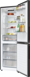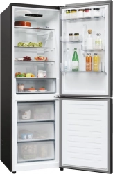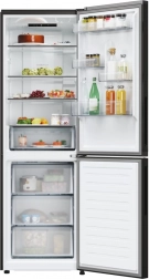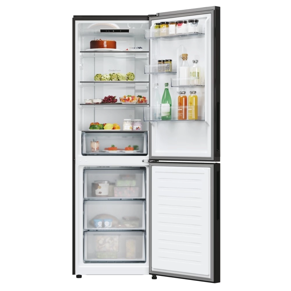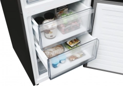 Acest frigider independent cu congelator jos îmbină designul elegant negru cu o organizare interioară practică. Rafturile late din sticlă, compartimentele reglabile pe înălțime din uși și iluminarea LED clară oferă o vizibilitate excelentă asupra alimentelor. Sertarele transparente din congelator facilitează organizarea și găsirea rapidă a produselor depozitate.