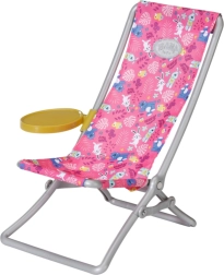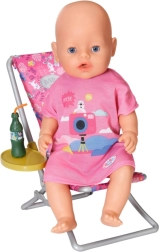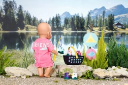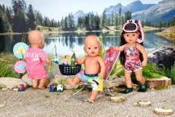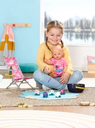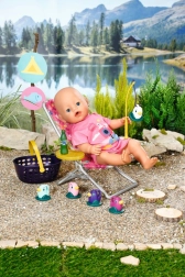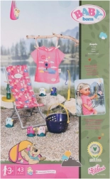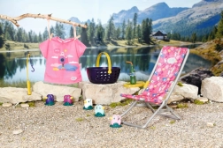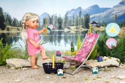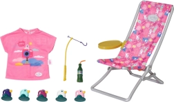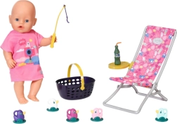 Setul de weekend pentru pescuit BABY born conține hăinuță, șezlong cu măsuță, sticlă cu limonadă, coșuleț, 5 rățuște și undiță.