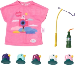 „În mare sunt mult mai mulți pești…” Dar BABY born preferă să prindă rățuște drăgălașe. În timp ce stă comod pe un șezlong roz cu model colorat, încearcă să agațe în cârligul undiței una dintre cele cinci rățuște. Din când în când mai sorbește din limonada pe care o are așezată pe măsuța galbenă de lângă șezlong. Când pescuiește toate rățuștele și le pune în coșul albastru, le pune înapoi în iaz și jocul distractiv poate începe din nou. Pentru acest joc de pescuit, BABY born a îmbrăcat un tricou roz lung, lejer, cu un imprimeu drăguț.