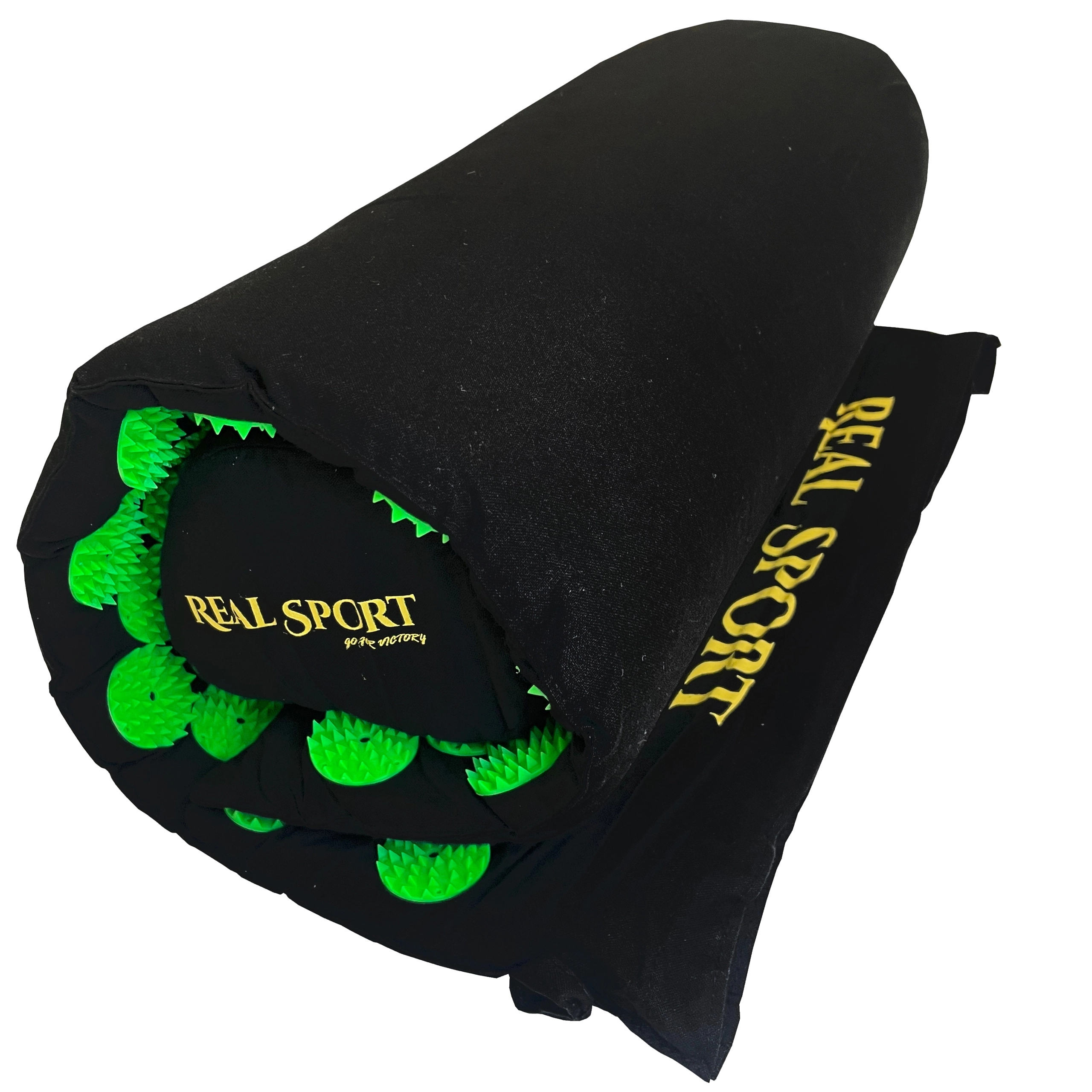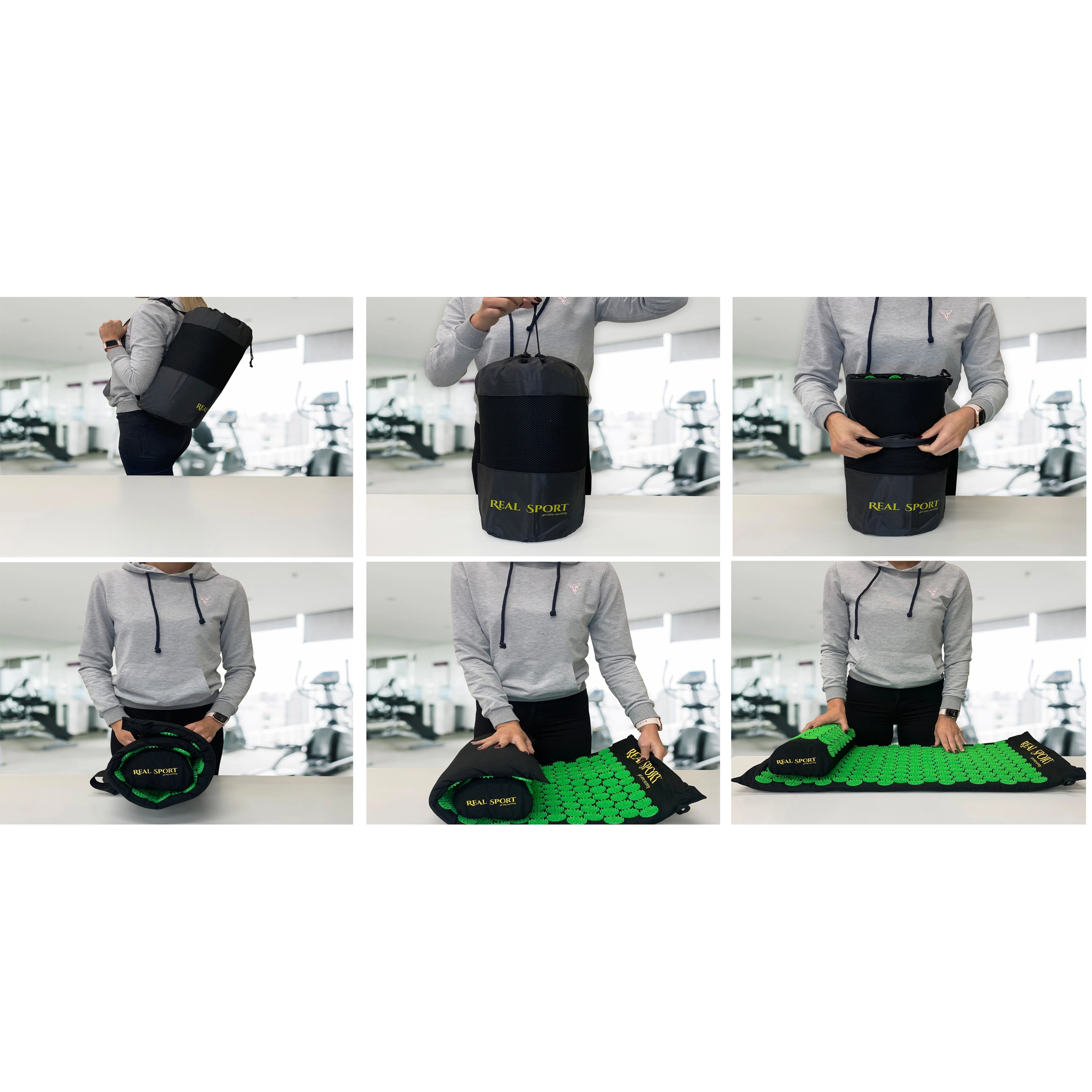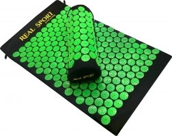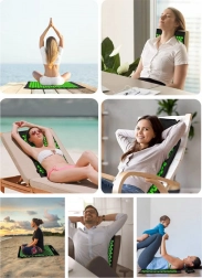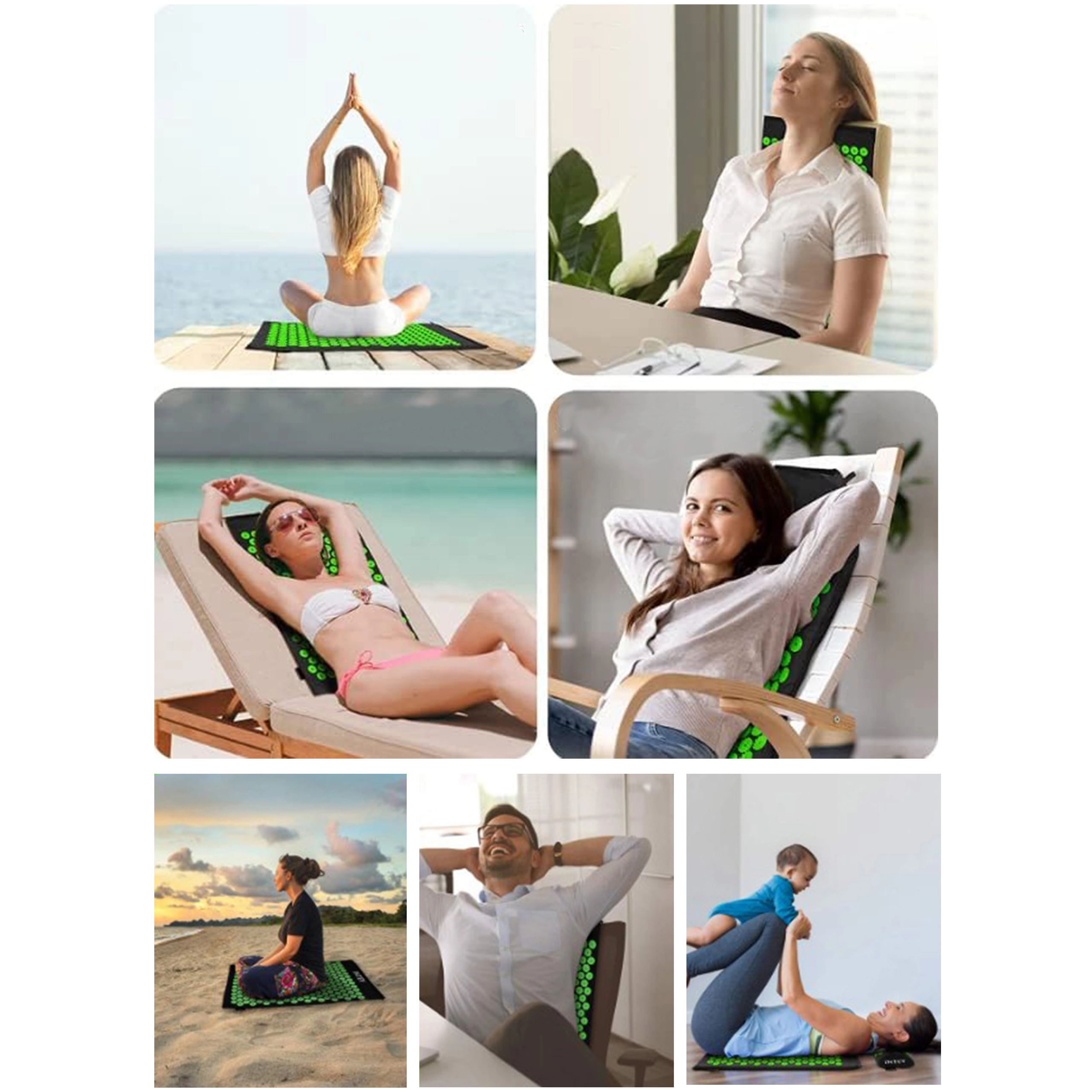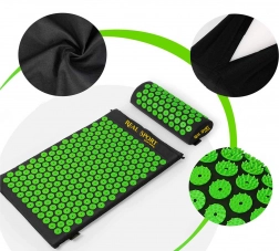 Setul de acupresiune (saltea + perniță) reproduce efectul acupresiunii tradiționale și ajută la reducerea tensiunii din spate, ceafă și umeri. Zeci de discuri verzi cu vârfuri vizează punctele de presiune, susținând relaxarea, regenerarea mușchilor și circulația naturală. Datorită construcției ușoare și husei incluse, îl poți lua cu ușurință acasă, la birou sau în călătorii.