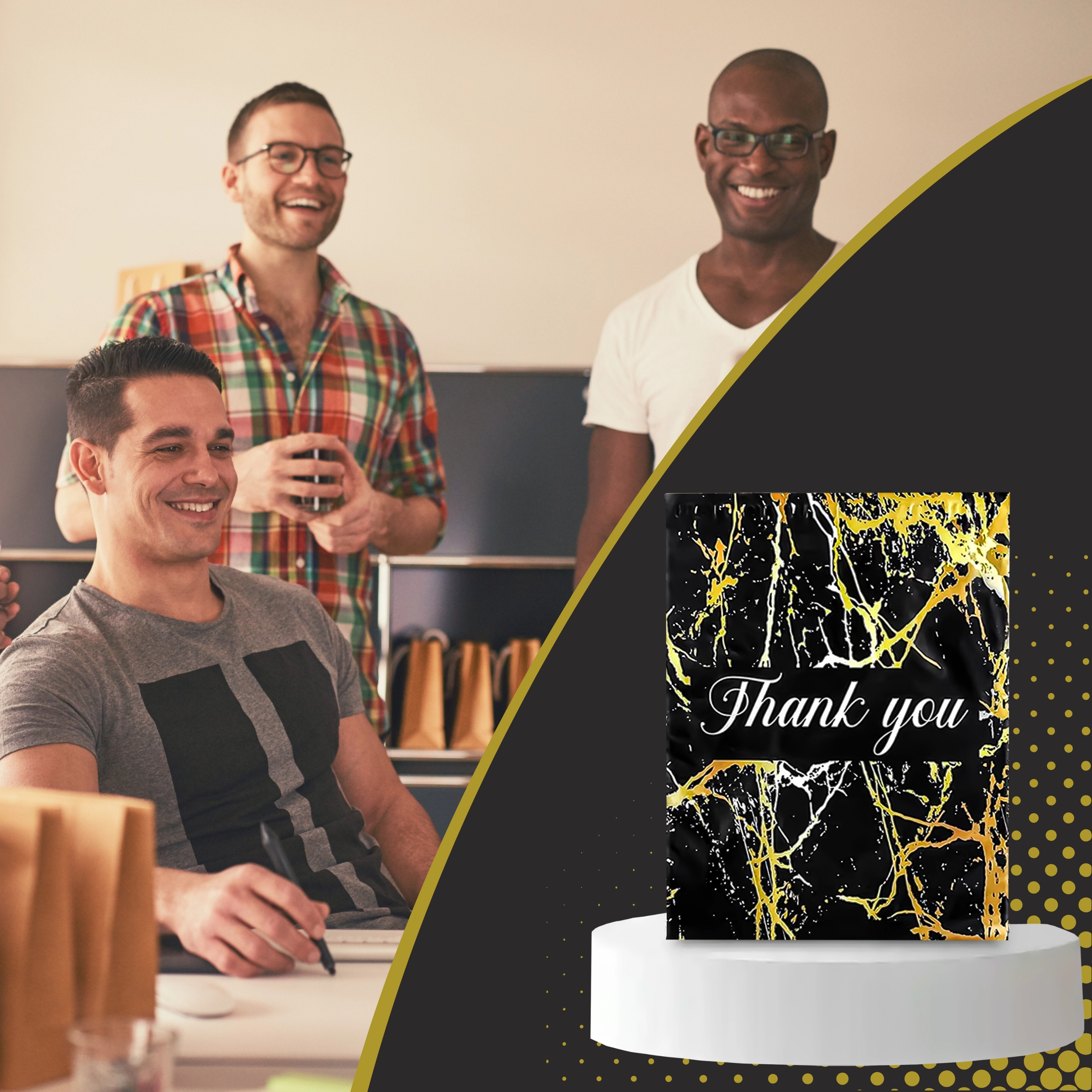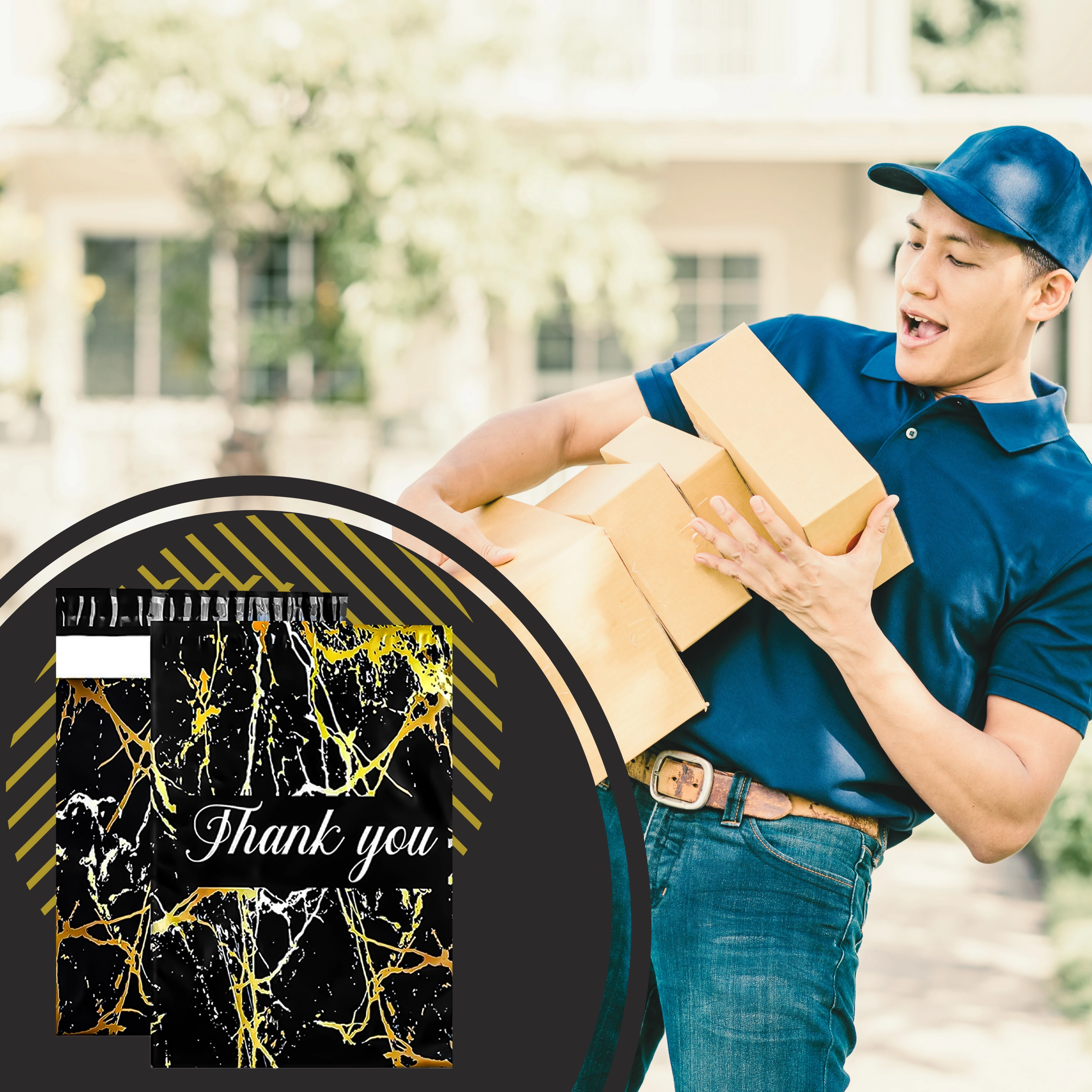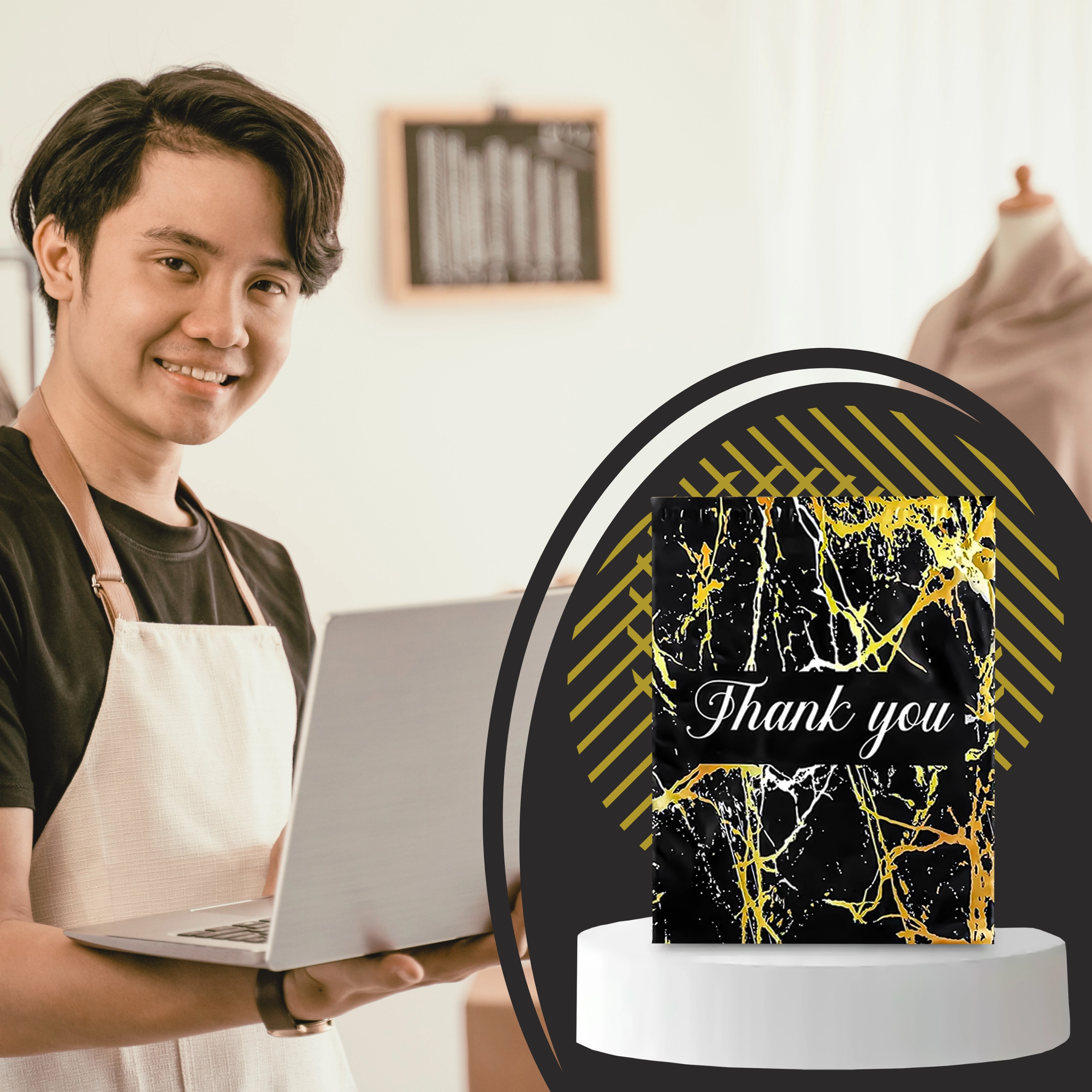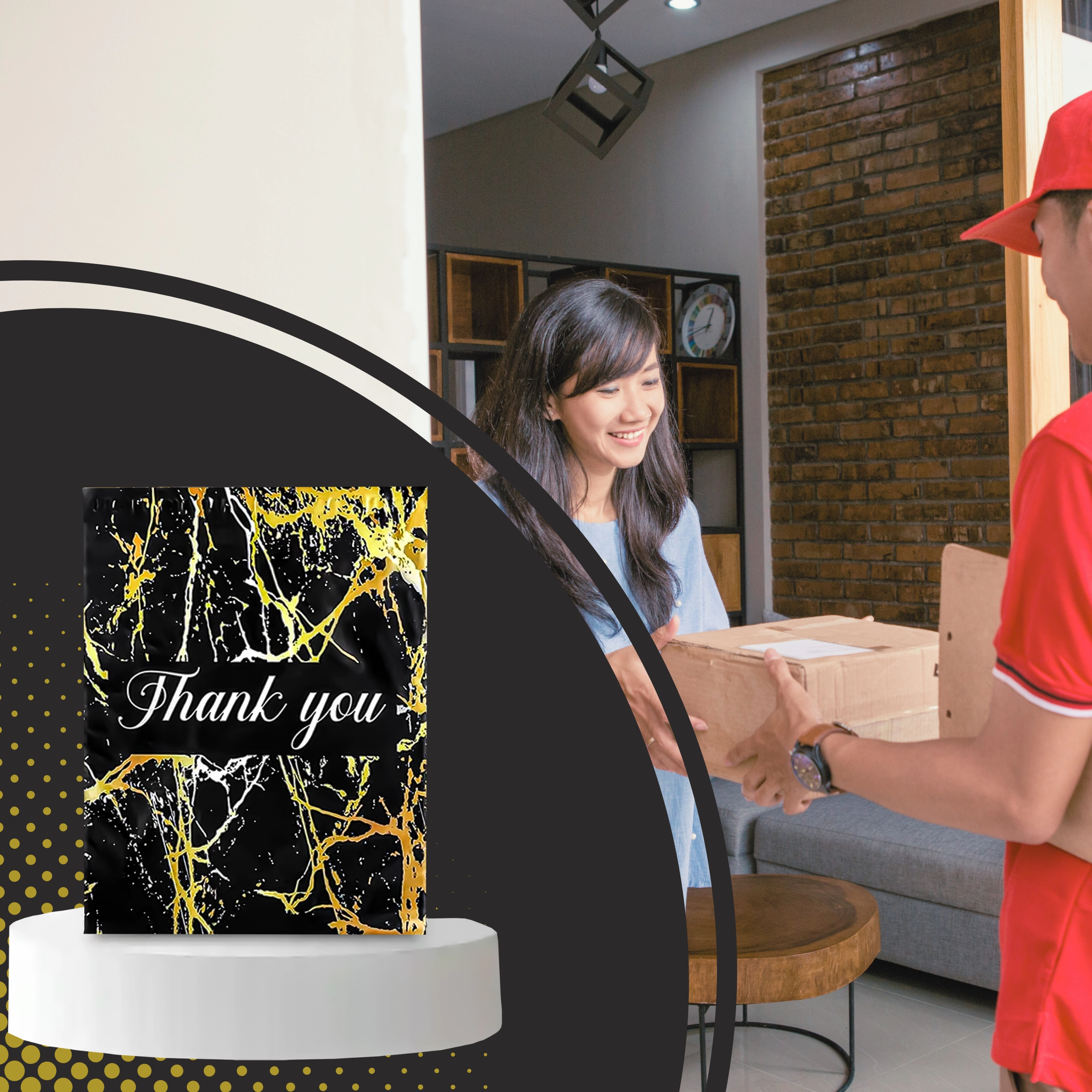 Căutați o soluție de ambalare fiabilă pentru coletele dvs.? Aceste plicuri de curierat combină durabilitatea, siguranța și un aspect profesional. Suprafața neagră mată cu motiv de marmură aurie și mesajul de mulțumire Thank You are un aspect reprezentativ și amplifică experiența de cumpărare.