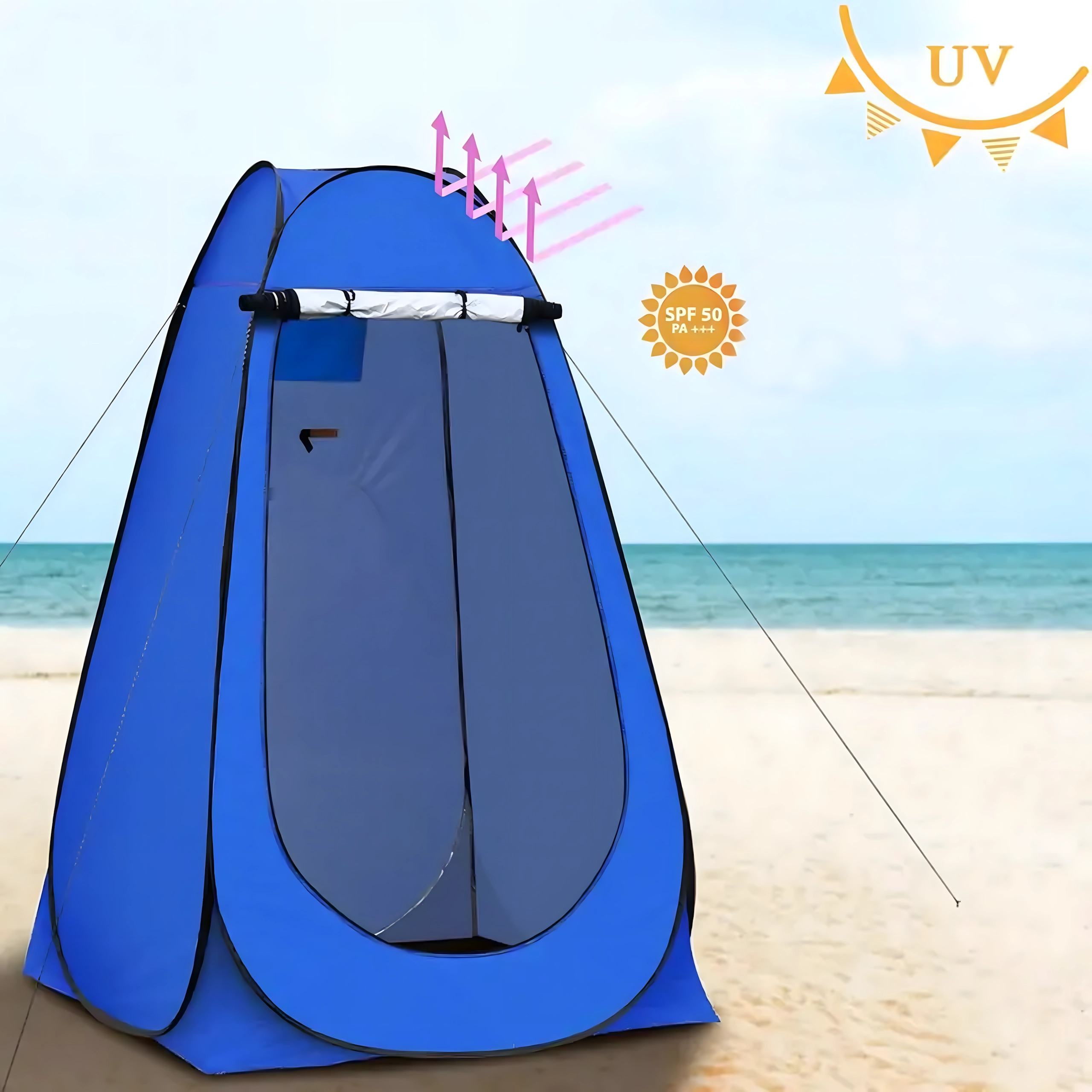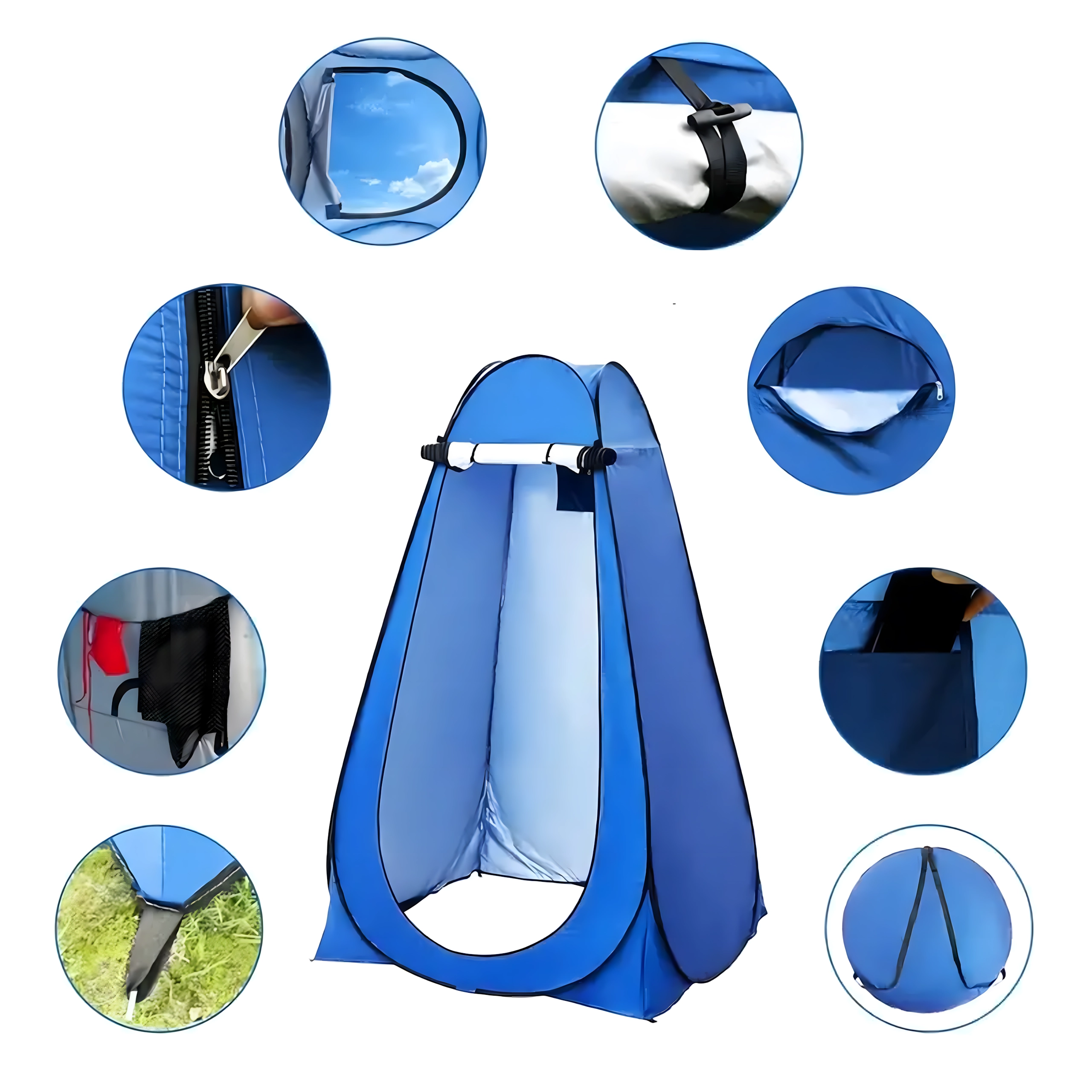 Construcția înaltă permite schimbatul sau dușul în mod confortabil, fereastra de aerisire asigură circulația aerului, iar intrarea mare cu fermoar îmbunătățește accesul. La interior găsiți elemente practice pentru organizare.