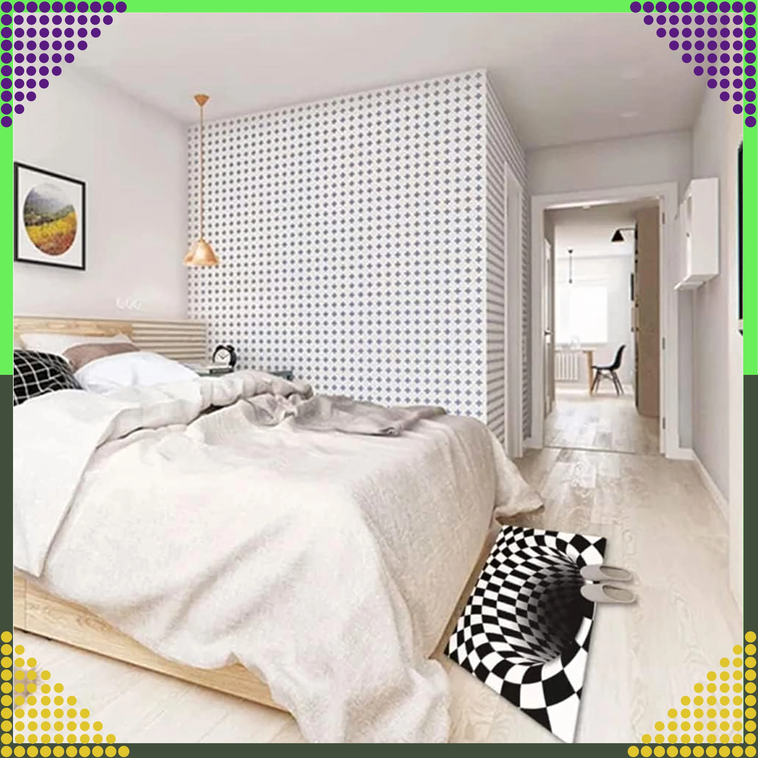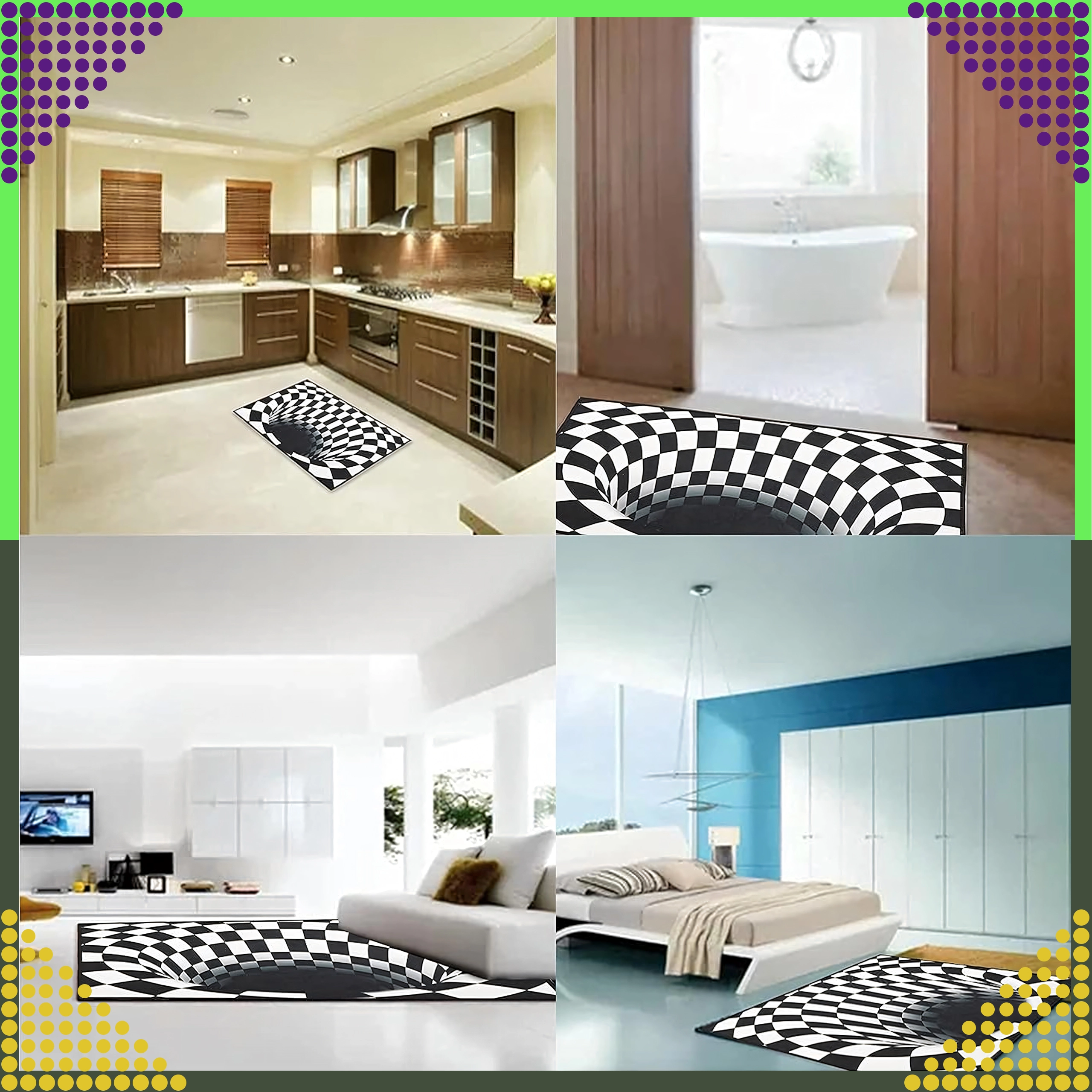 Vortexul în carouri alb-negru creează o iluzie optică puternică de profunzime. Un element stilat care pune în valoare orice interior și zonă de intrare.