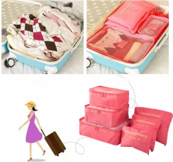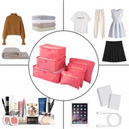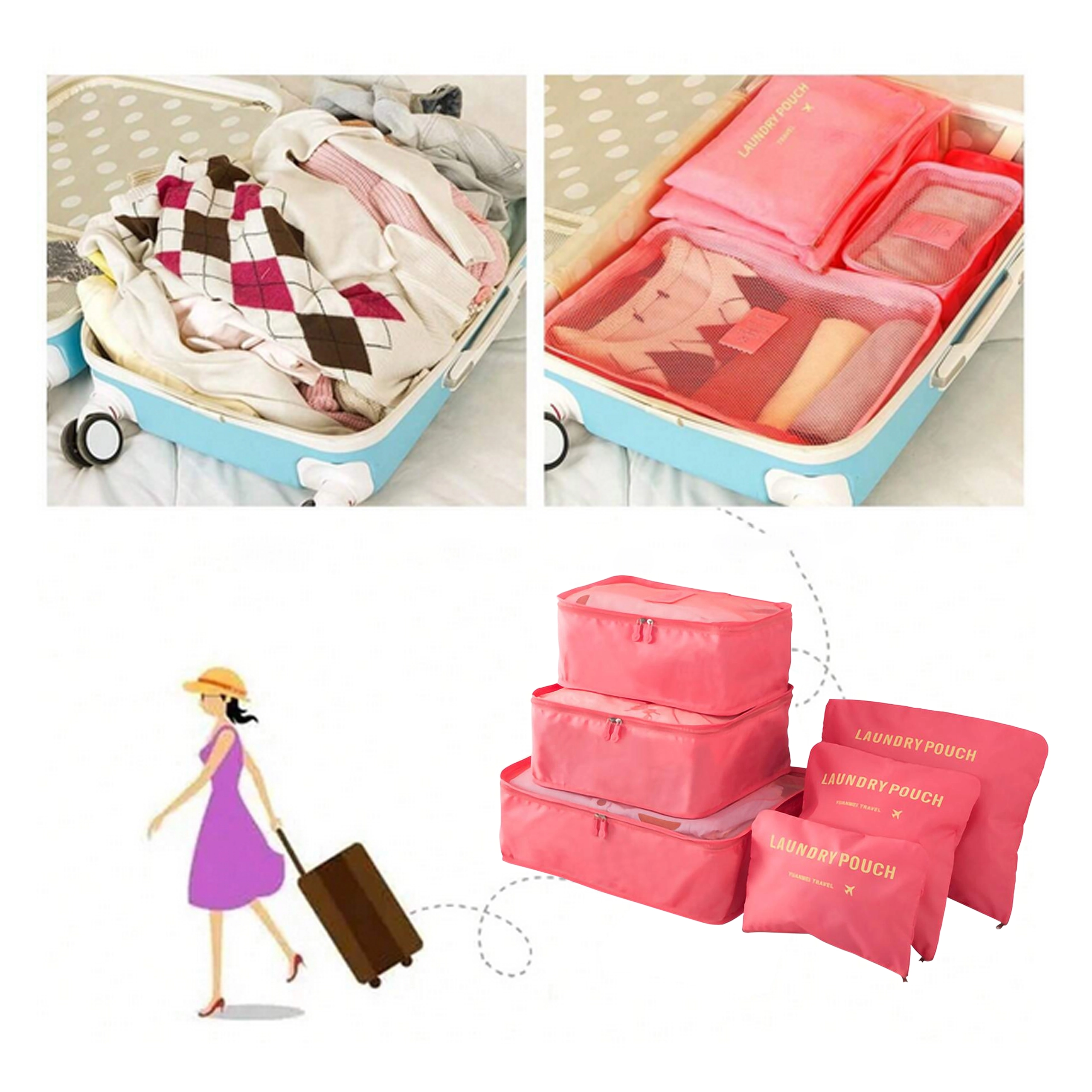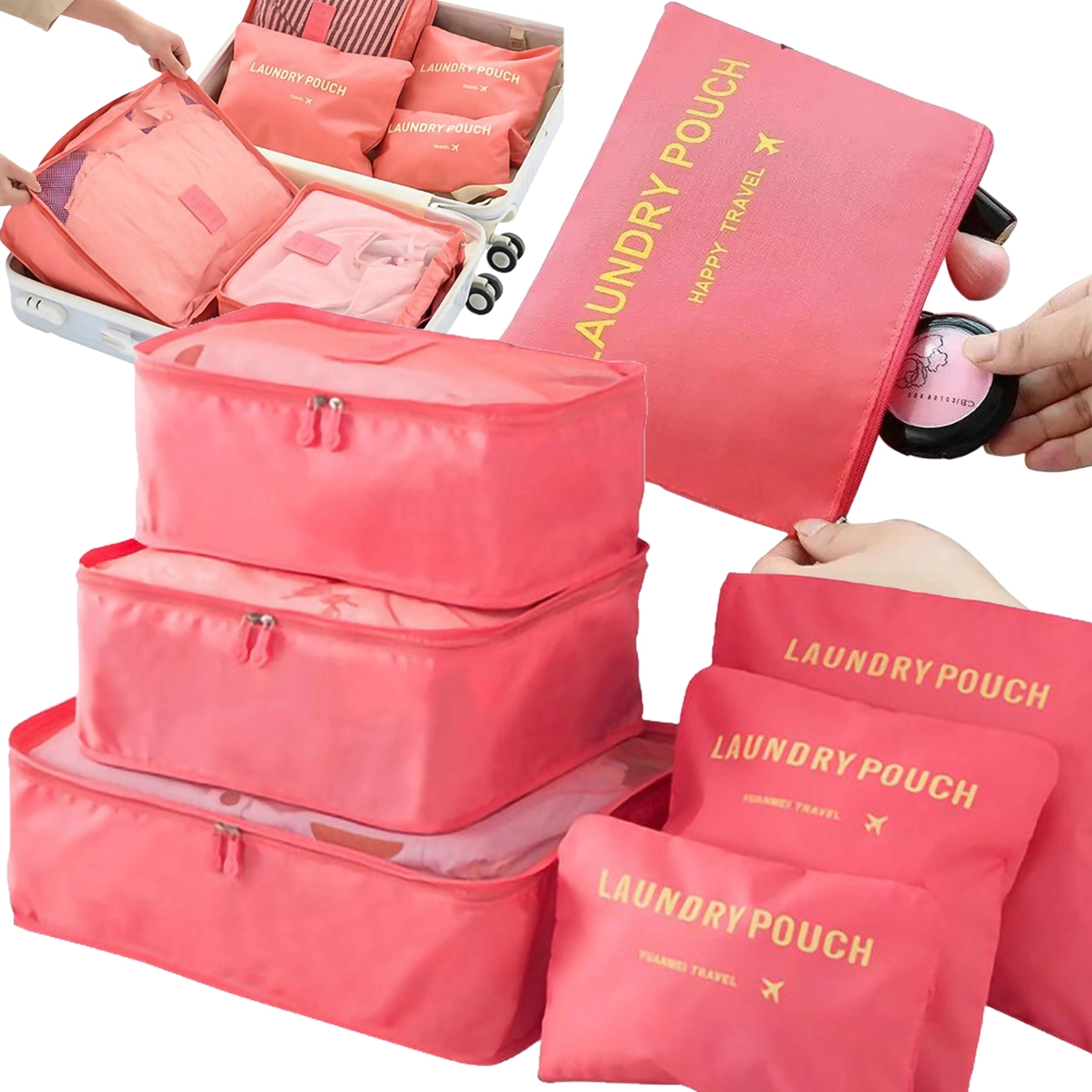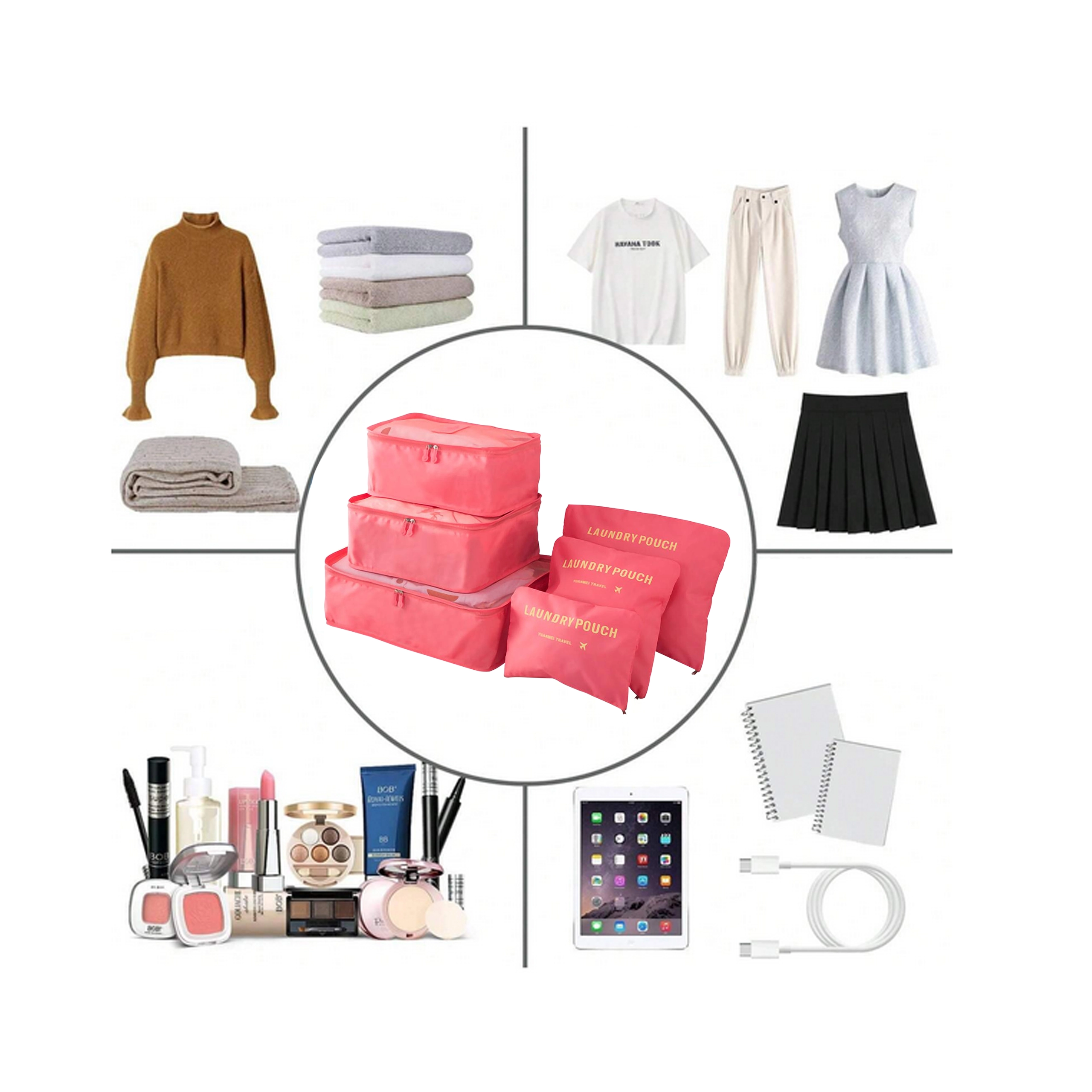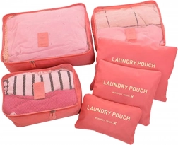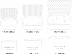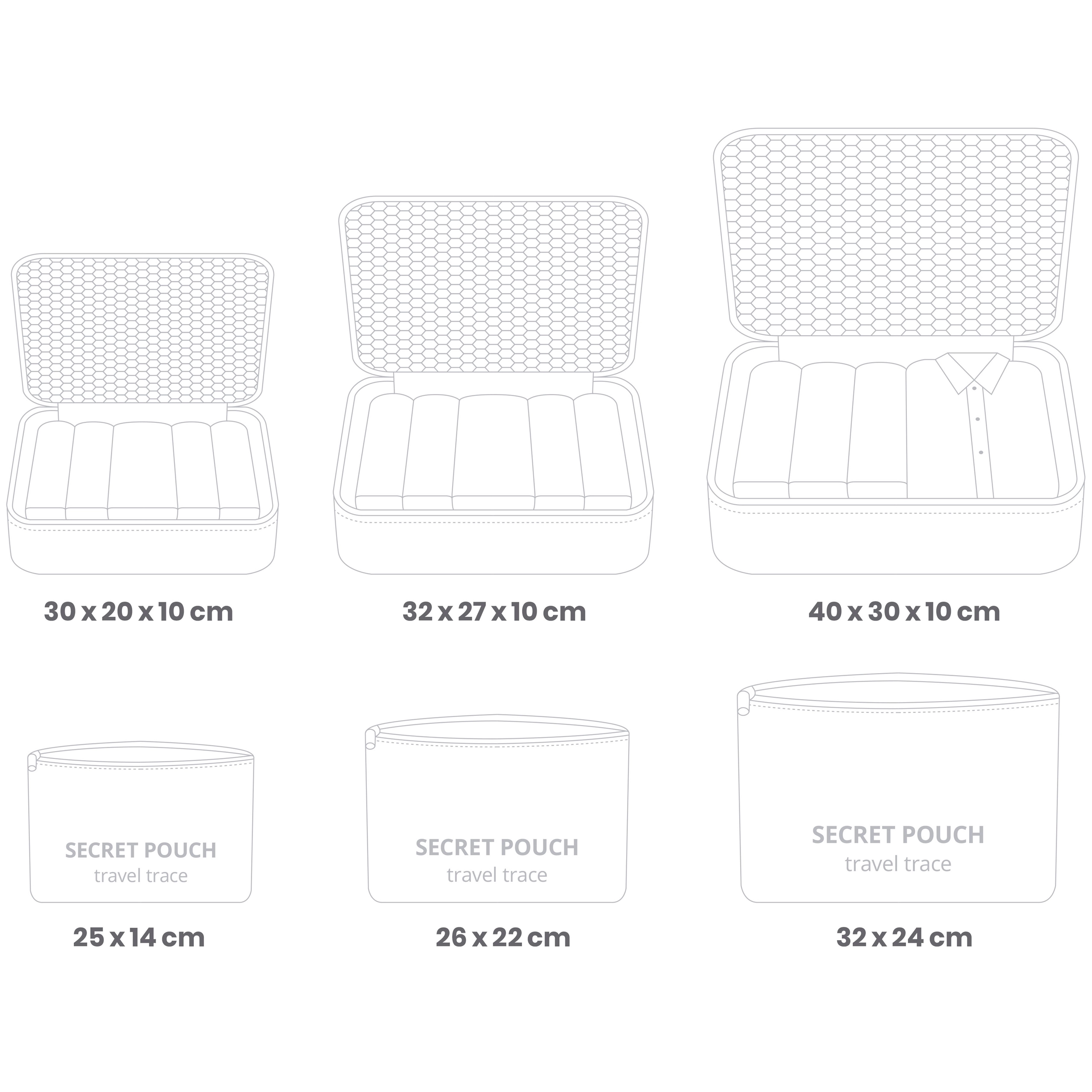 Setul include trei cuburi încăpătoare cu plasă respirabilă și trei buzunare plate marcate „Laundry Pouch” pentru rufe murdare. Materialul textil ușor și fermoarele rezistente asigură împachetare comodă, vizibilitate și protecția lucrurilor în timpul călătoriilor.
