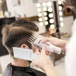 Mânerul profilat, cu orificiu pentru agățare, asigură confort și stabilitate în timpul sesiunilor lungi de tuns, atât în salon, cât și acasă.