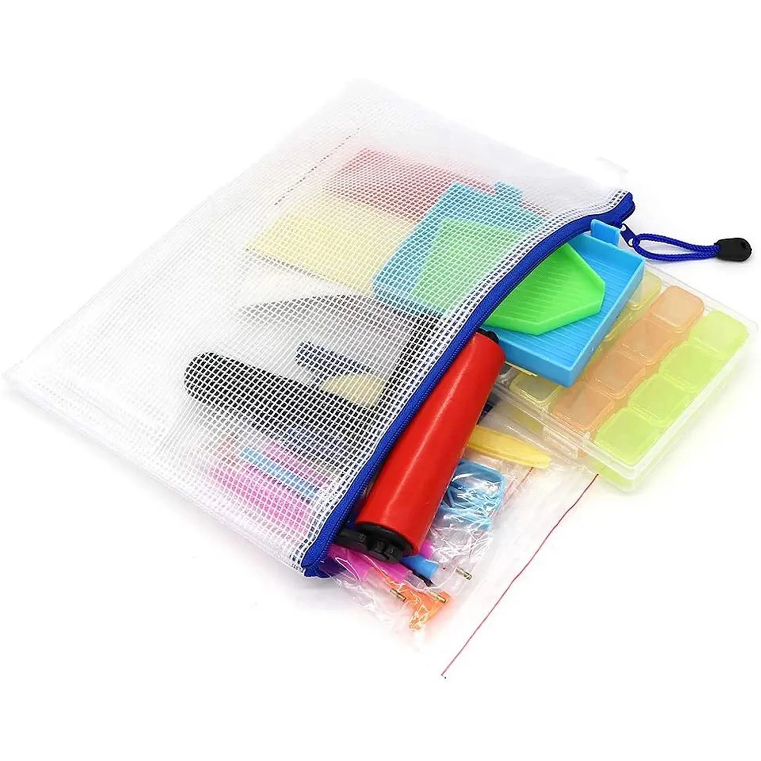 Husa transparentă din plasă cu fermoar și cutia cu compartimente păstrează totul ordonat și gata de creat oriunde.