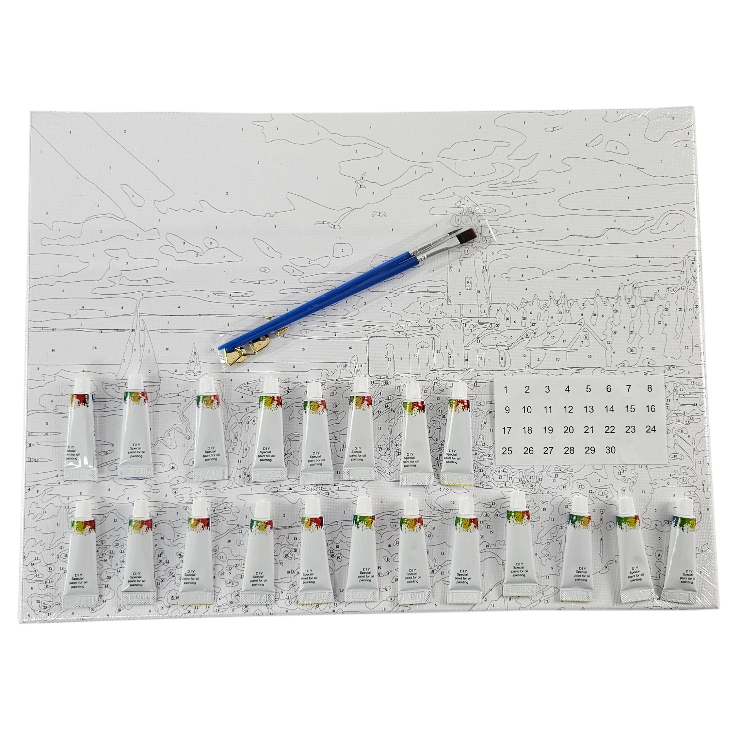 Setul include pânză 30 × 40 cm, vopsele acrilice și pensule – trebuie doar să deschizi și să începi să pictezi, fără alte cumpărături.